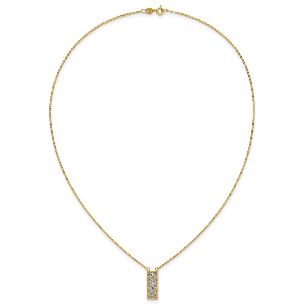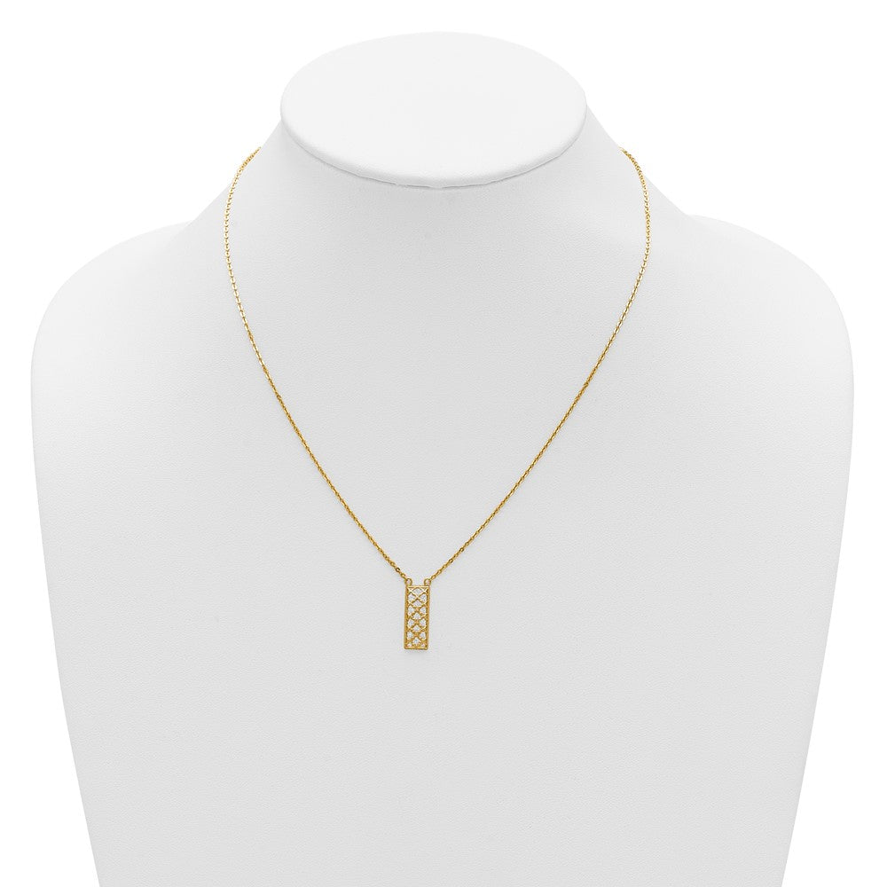 The 14K Two-Tone 14K Polished / Dia-Cut Bar Necklace is a stunning piece that adds style to any look. Crafted from pure 14K gold with a bright polished finish, it features a sleek bar at 17.5mm long and 7mm wide, accented by a sparkling diamond-cut design. The necklace measures 18 inches long and has a durable cable chain with a spring ring clasp for a secure fit. Its two-tone silver and gold hues make it versatile for any occasion. This elegant necklace is built to last and comes with a lifetime guarantee.
