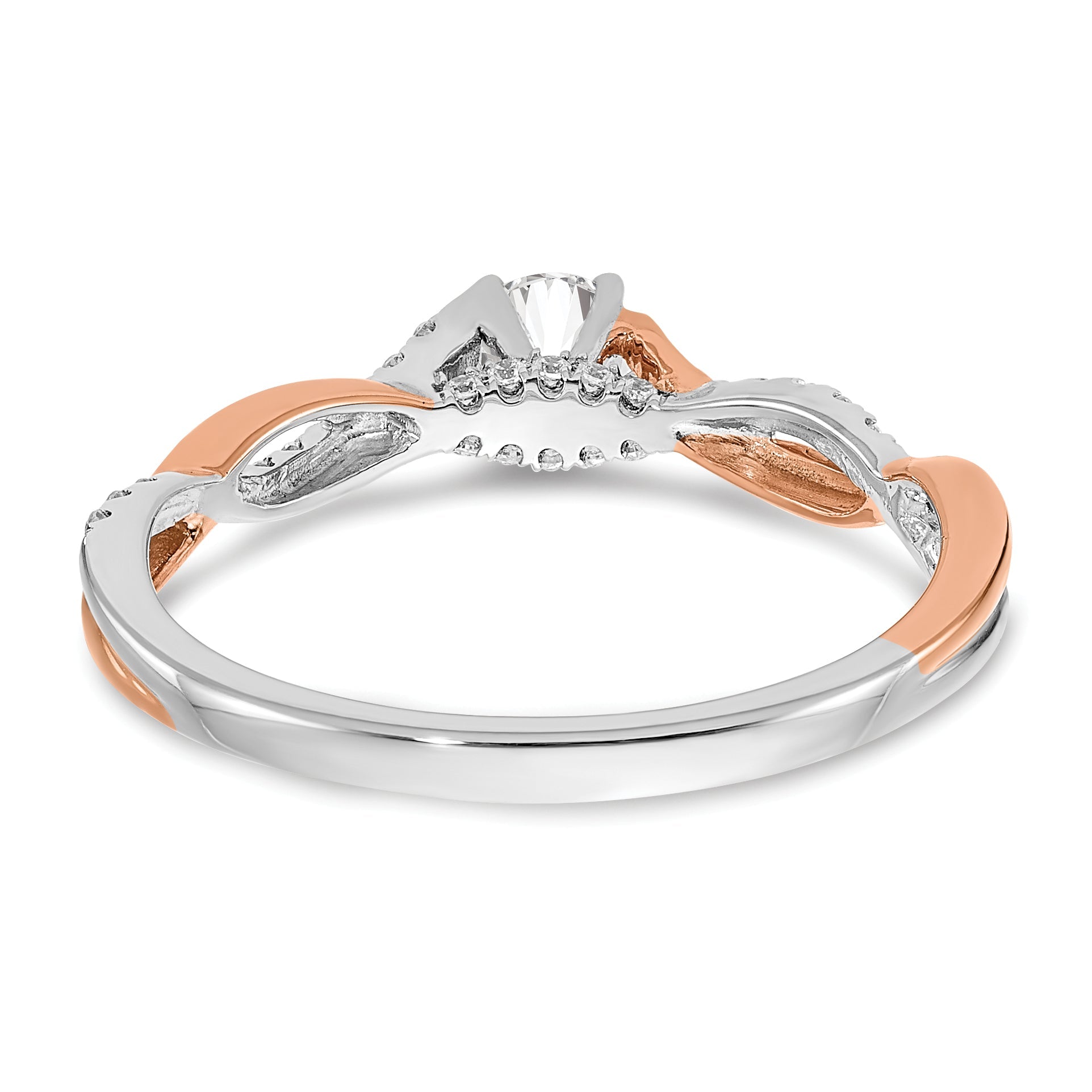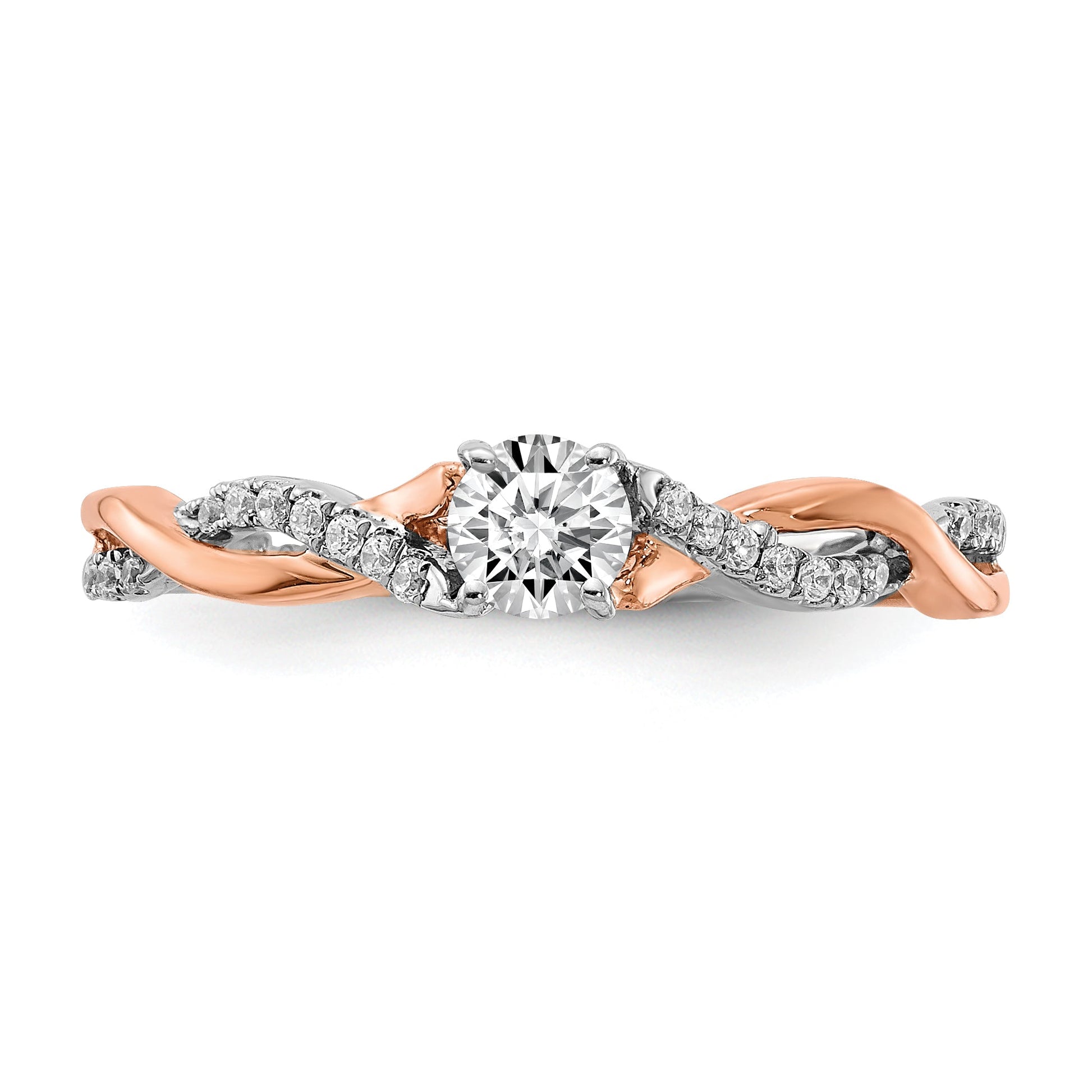 Make your proposal special with the 14K Two-Tone White and Rose Gold Criss-Cross Semi-Mount Engagement Ring. This eye-catching piece features a unique criss-cross design crafted from polished 14K gold, blending white and rose tones for a stunning look. It’s built to hold a 1/4 carat round center stone, which makes it perfect for personal touches. With a slim band, the ring offers a comfortable fit and an elegant silhouette. The semi-mount style allows you to choose your favorite gemstone, creating a custom look that lasts forever. The 14K Two-Tone White and Rose Gold Criss-Cross Engagement Ring is a true symbol of love.