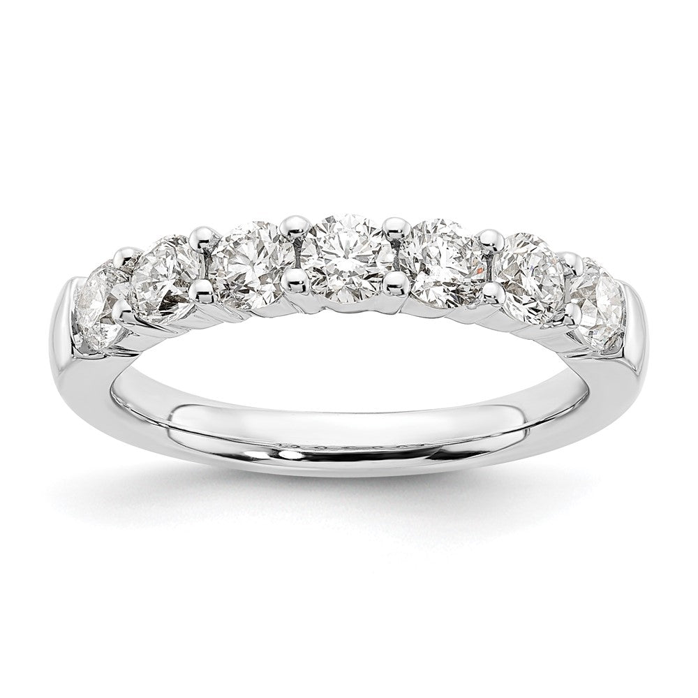 Introducing the dazzling 14k White Gold 1 1/5 Carat Lab Grown Diamond Seven Stone Band Ring, an ideal choice for those who cherish style and sustainability. This stunning piece flaunts seven expertly crafted lab-grown diamonds, each with a clarity ranging between VS and SI, ensuring exceptional brilliance and fire. The round stones are set in polished 14k white gold, giving the ring a sleek finish. With sizes ranging from 6 to 8, it guarantees a perfect fit for every occasion. Elegant and timeless, this piece is a must-have for any jewelry collection.