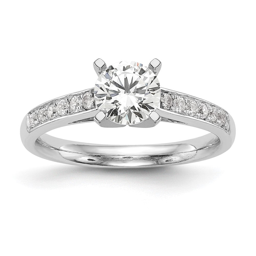 This 14k White Gold Lab Grown Diamond Engagement Ring dazzles with a modern touch. It features a 6.5 mm round center stone, gleaming amid a halo of twelve smaller 1.7 mm round lab-grown diamonds. The center stone boasts a one-carat weight, while the halo adds 0.022 carats of brilliance. Each diamond shines with VS/SI+ clarity and a G+ color grade, ensuring a breathtaking sparkle. Crafted in fine 14k white gold with a rhodium plating, this ring promises lasting beauty. This stunning peg-set ring is the perfect symbol of everlasting love.