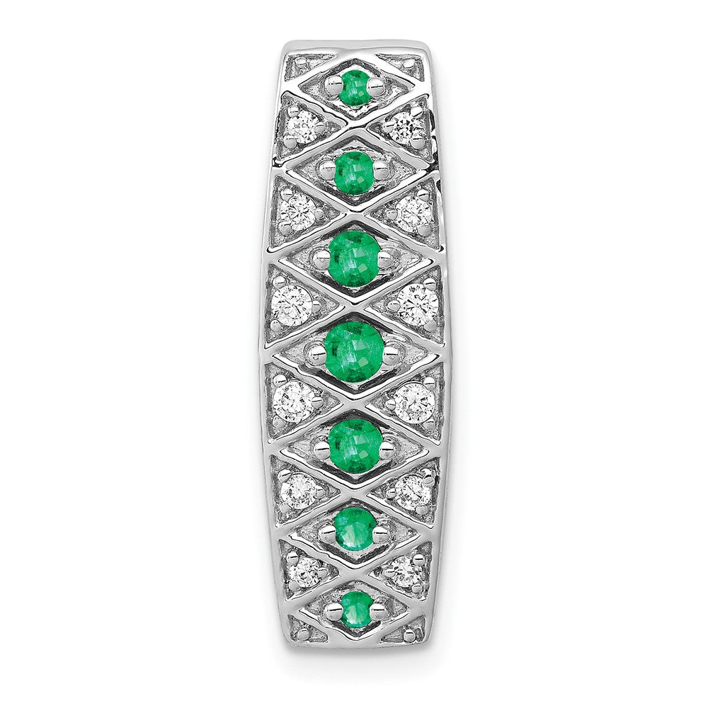 The 14k White Gold 1/5 Carat Lab Grown Diamond VS/SI+ G+ and Lab Created Emerald Chain Slide Pendant captures pure elegance. Crafted in radiant 14k white gold, this pendant showcases vibrant lab-created emeralds paired with sparkling lab-grown diamonds. The emeralds flaunt a rich green hue, while the diamonds shimmer with unmatched clarity. Each gemstone is round cut, exuding classic beauty. Rhodium plating adds a sleek finish, enhancing the pendant's shine. This piece offers timeless charm, making it a stellar addition to any jewelry collection. Embrace allure and grace with the 14k White Gold 1/5 Carat Lab Grown Diamond and Lab Created Emerald Pendant.