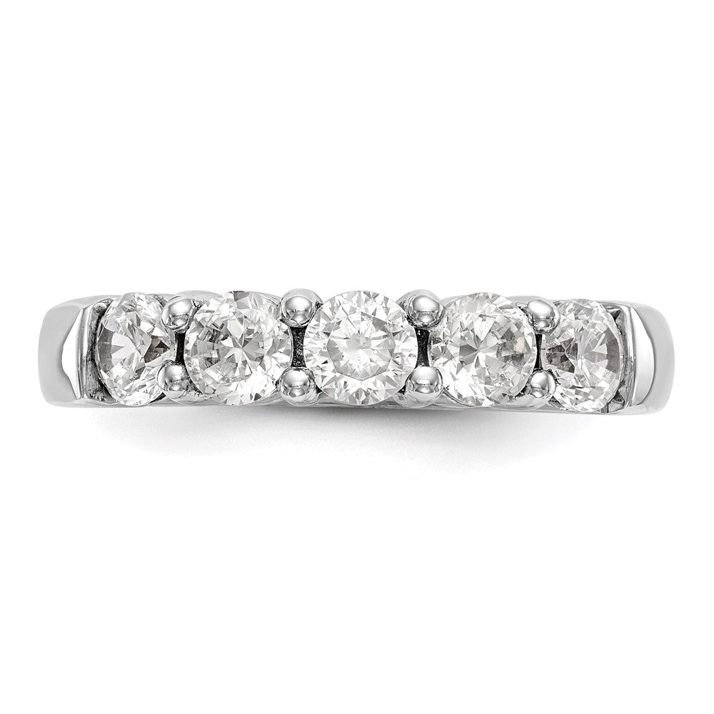 Introducing the dazzling 14k White Gold 1 Ct. Lab Grown Diamond Five Stone Fashion Band Ring. This chic ring boasts five brilliant lab-grown diamonds, each with superior VS/SI+ clarity and a sparkling G+ color grade. Set in polished 14K white gold with a sleek rhodium plating, the gems are round, measuring 3.8 mm each, adding up to a total weight of 1 carat. Available in sizes ranging from 6 to 8, this ring is perfect for those seeking elegance and sophistication. Slip on this beauty and make every day shine.