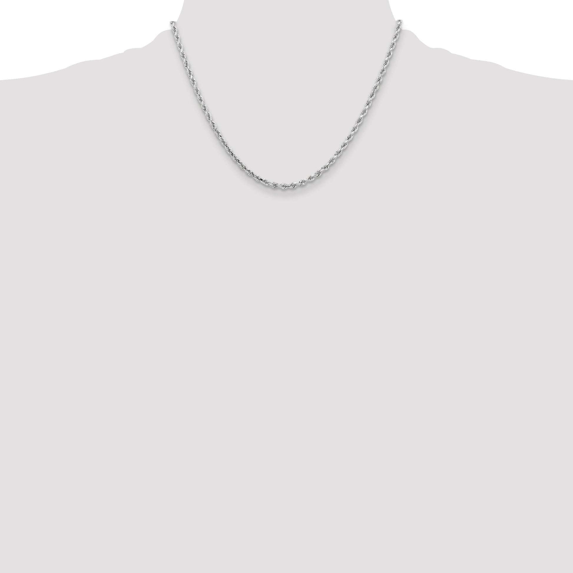 The 14k White Gold 18-inch Diamond-cut Rope Chain with Lobster Clasp is pure elegance. Crafted from 14k white gold, it boasts a polished finish and rhodium plating. The 18-inch length is ideal for every neckline, while the 3.25mm width provides a perfect balance of subtlety and style. The diamond-cut texture adds a hint of sparkle, enhancing the chain's polished look. Secured with a durable lobster clasp, this solid gold women's necklace ensures both beauty and reliability. Upgrade your jewelry collection with the timeless 14k White Gold 18-inch Diamond-cut Rope Chain with Lobster Clasp.