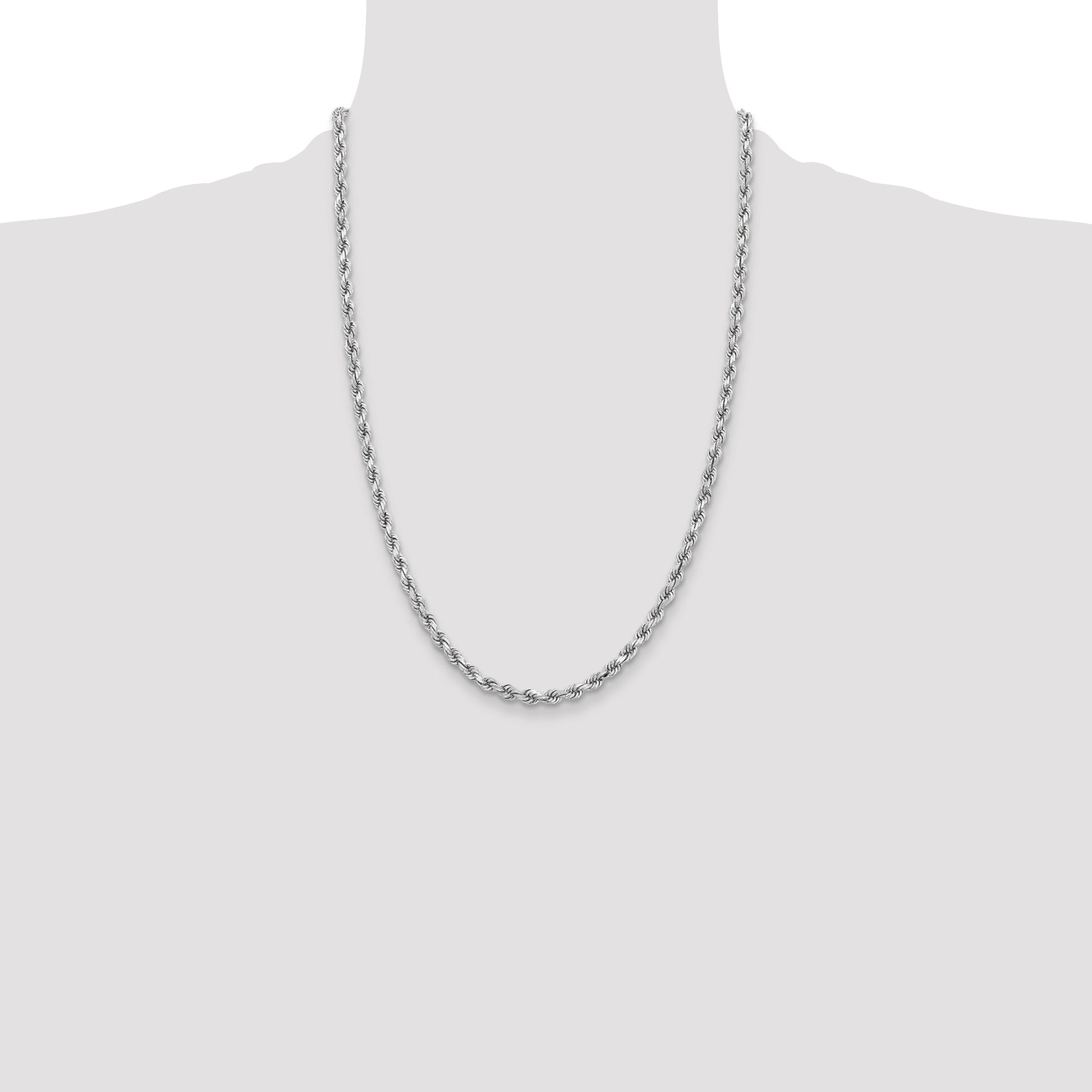 Discover the elegance of the 14k White Gold 24-Inch Diamond-Cut Rope Chain. Crafted from solid 14k gold, this polished necklace offers a sleek, rhodium-plated finish for added shine. Measuring 24 inches in length and 3.75 mm in width, it features a durable lobster clasp, ensuring a secure fit. The diamond-cut texture brings a touch of sparkle, making it perfect for any occasion. Make a statement with the 14k White Gold 24-Inch Diamond-Cut Rope Chain, a timeless piece that enhances any jewelry collection.