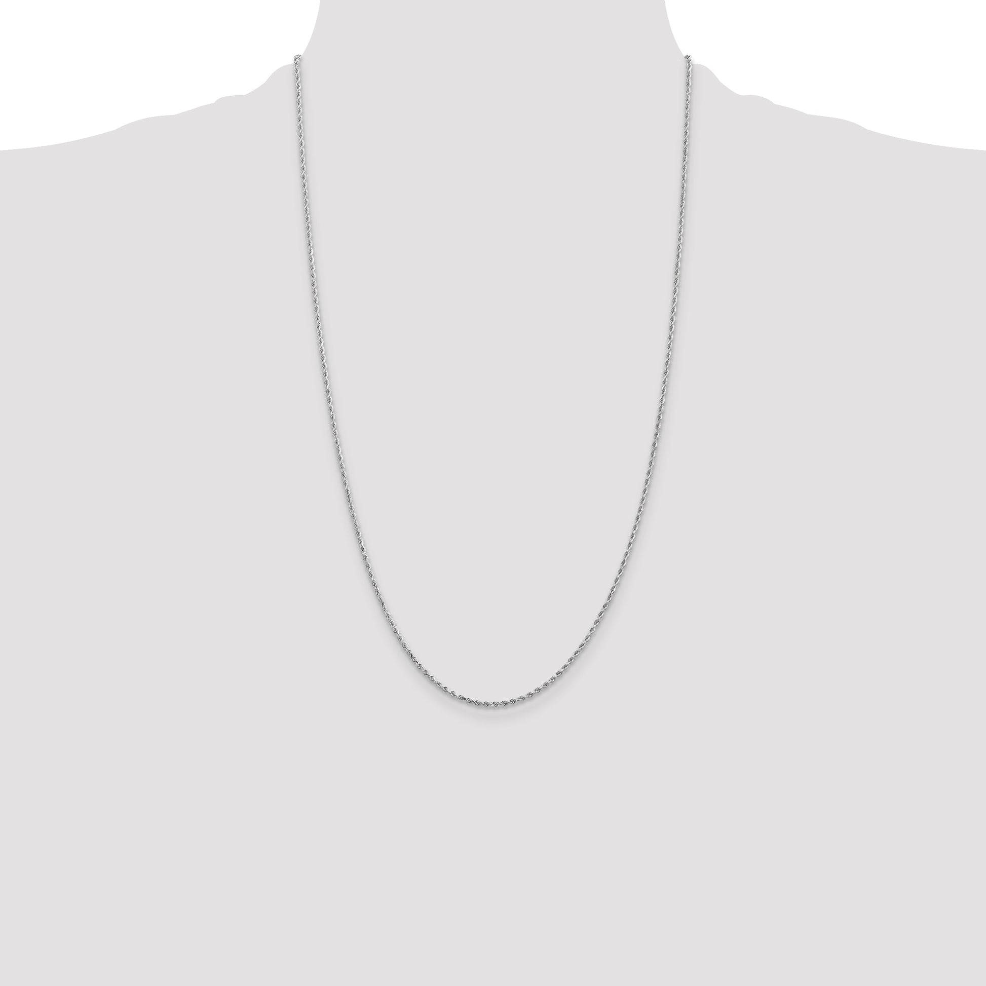 Indulge in timeless elegance with our 14K White Gold 26-inch Diamond-Cut Rope Chain. This classy piece sparkles with its polished finish and intricate diamond-cut texture. Crafted from pure 14K gold and plated with rhodium, it promises both beauty and durability. The 1.5mm width adds a delicate touch, while the lobster clasp ensures secure wear. Hand-made with precision, this solid chain exudes sophistication. Ideal for the modern woman, the 14K White Gold Diamond-Cut Rope Chain is a versatile addition to any jewelry collection.