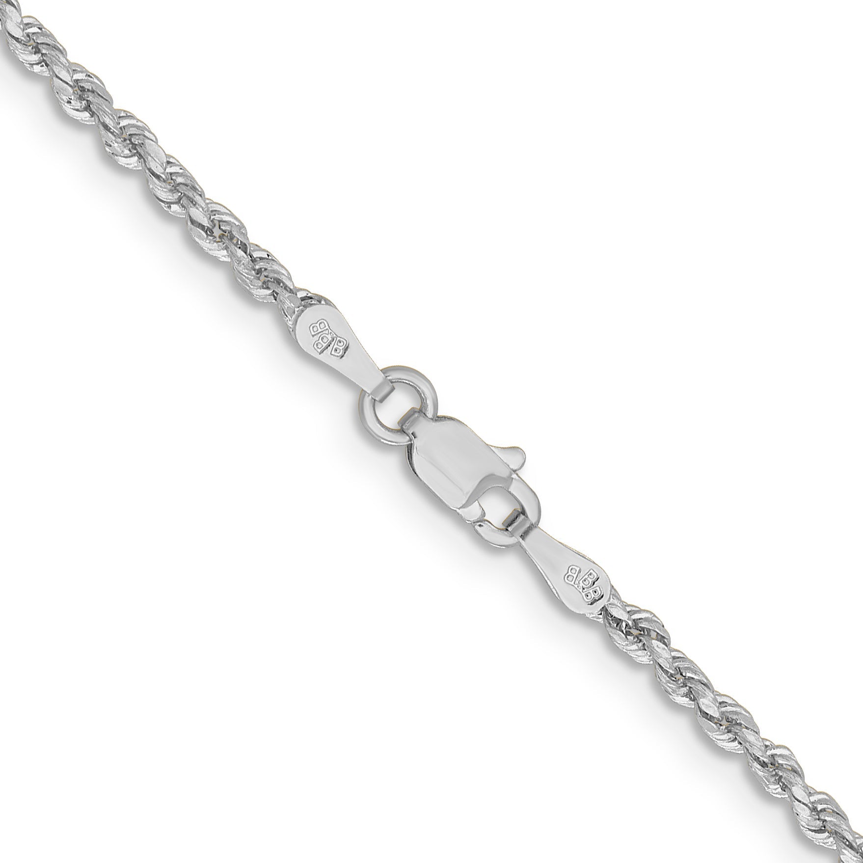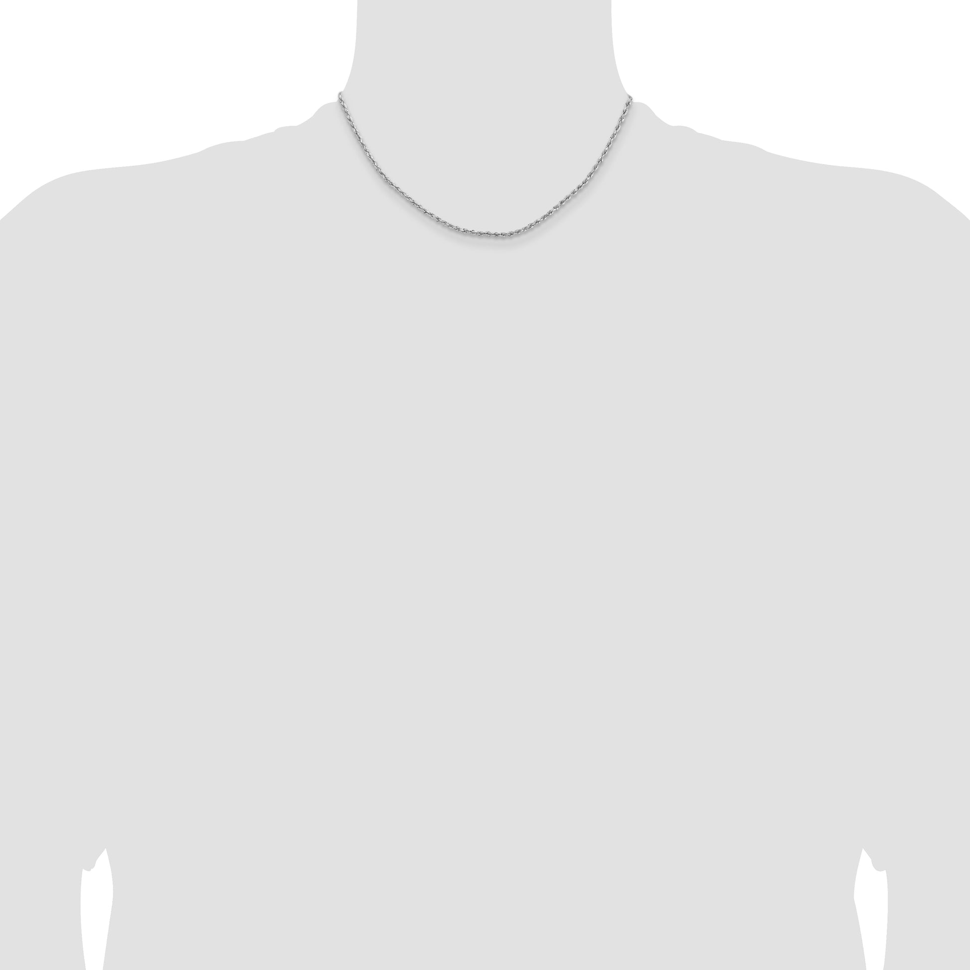 The 14k White Gold 2mm Lightweight D/C Rope with Lobster Clasp Chain exudes elegance and sophistication. Crafted from 14k white gold, this chain features a stunning diamond-cut texture that sets it apart. At 16 inches in length, it sits perfectly on the neckline, making it ideal for daily wear or special occasions. The durable lobster clasp ensures secure fastening while the rhodium plating adds an extra layer of shine and protection. Elevate your jewelry collection with this timeless piece. The 14k White Gold D/C Rope Chain is truly a must-have accessory for every jewelry lover.