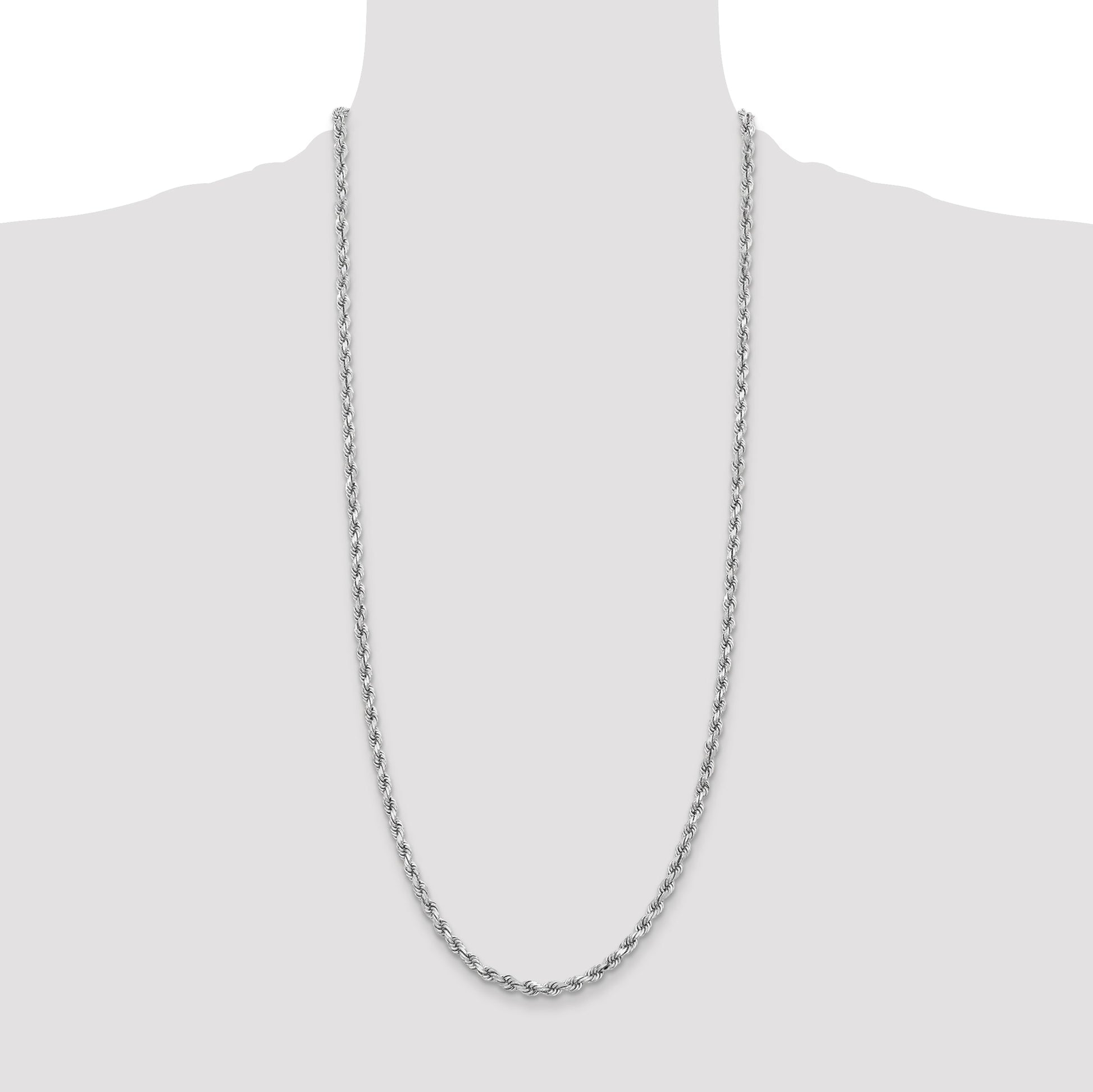 The 14k White Gold 30-inch Diamond-cut Rope Chain exudes elegance and charm. This beautiful necklace features a polished 14k white gold surface, offering a timeless appeal. The 3.75mm-wide rope chain, adorned with intricate diamond-cut details, catches the light perfectly. It comes with a secure lobster clasp, ensuring a snug fit for everyday wear. Rhodium plating enhances its luster, making it a standout piece in any jewelry collection. Treat yourself or a loved one to the sophistication of the 14k White Gold 30-inch Diamond-cut Rope Chain.