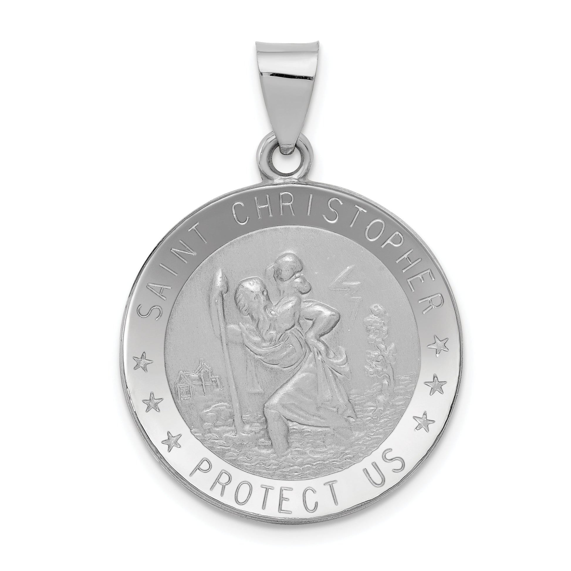 The 14k White Gold Polished/Satin St Christopher Medal Hollow Pendant is a beautiful piece of jewelry that radiates elegance. Made from high-quality 14k white gold, it features both a polished and satin finish. With a length of 32 mm, this hollow pendant showcases detailed craftsmanship through its die-struck design. The charm measures 26 mm in length and 22.75 mm in width, offering a prominent yet stylish look. This themed pendant not only serves as a stunning accessory but also symbolizes protection and guidance. Elevate your jewelry collection with the 14k White Gold Polished/Satin St Christopher Medal Hollow Pendant today!