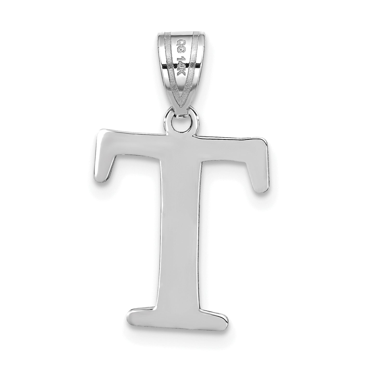 Introducing the stunning 14k White Gold Polished Etched Letter T Initial Pendant. This exquisite piece showcases a polished finish that shines brightly against the rhodium plating. Crafted from high-quality 14K white gold, the pendant features a laser-etched letter 'T', making it a perfect gift for yourself or a loved one. Its generous size captures attention without being overwhelming. Wear it solo or layer it with other necklaces for your own unique style. The 14k White Gold Polished Etched Letter T Initial Pendant is a striking addition to any jewelry collection.