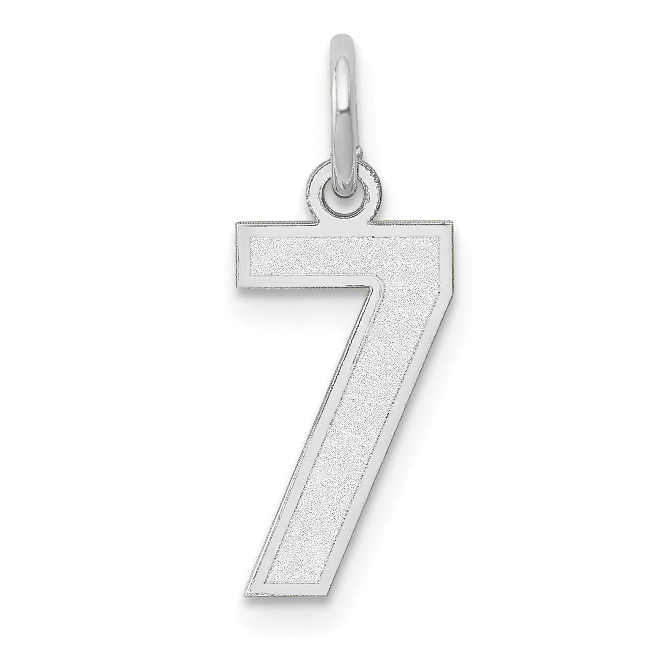 Savor the allure of our 14k White Gold Small Satin Number 7 Charm. Crafted with top-notch gold, this charm boasts 14K purity. It features a unique brushed finished complemented beautifully by rhodium plating. The charm measures 14.32 mm in length and 7.1 mm in width, giving it an effortlessly chic appeal. This charm is distinct with its laser cut design, and promising durability as evident in its primary gold material. As a pendant, the charm’s theme and satin texture speak volumes of your unique style statement. Sold individually, it is the perfect addition to your jewelry collection, highlighting the number seven in a petite size, and embodying elegance with its pure white color. Add a personal, luxury touch to your everyday look with our 14k White Gold Small Satin Number 7 Charm.