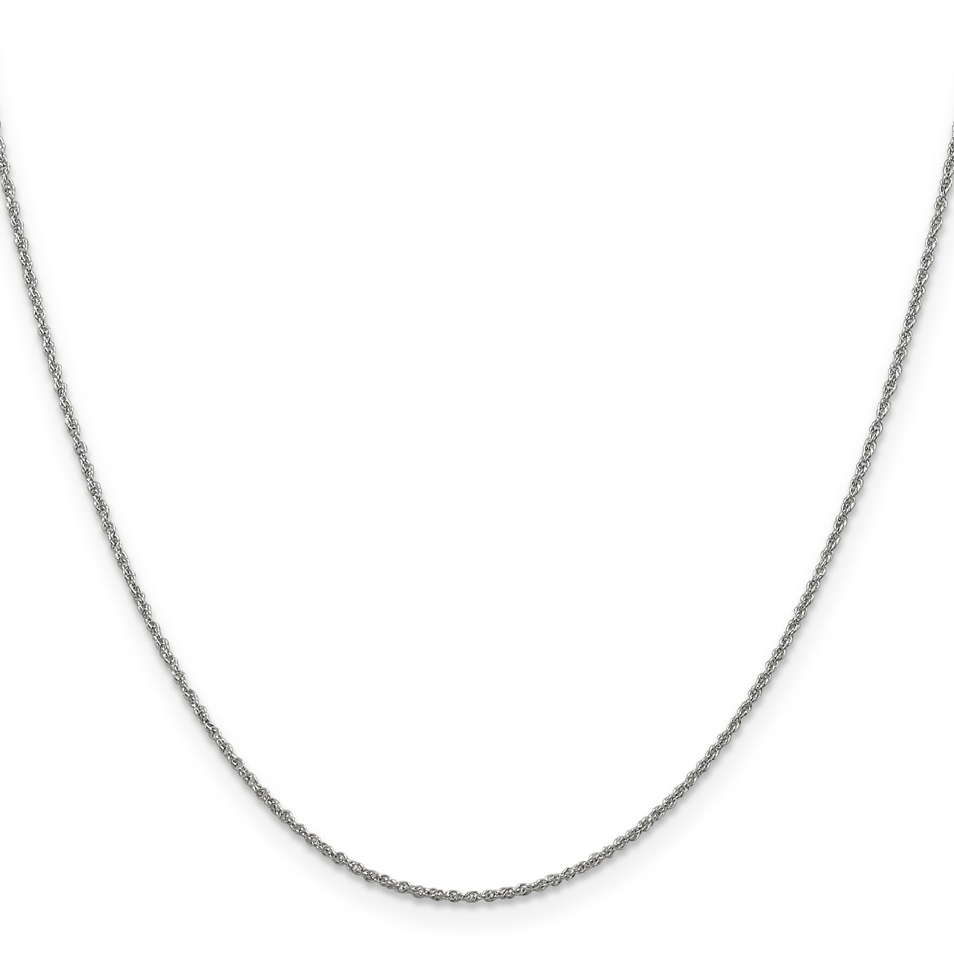 The 14K White Gold 16-Inch Baby Rope Chain is a must-have addition to any fine jewelry collection. Crafted from high-quality 14K white gold, this polished rope chain adds a touch of elegance to any outfit. Measuring 16 inches in length and featuring a 1.1mm width, its delicate design is perfect for showcasing your favorite pendant. The rhodium plating provides a lustrous finish, while the spring ring clasp ensures it stays secure around your neck. Ideal for women who appreciate timeless pieces, the 14K White Gold 16-Inch Baby Rope Chain stands out in its simplicity and sophistication.