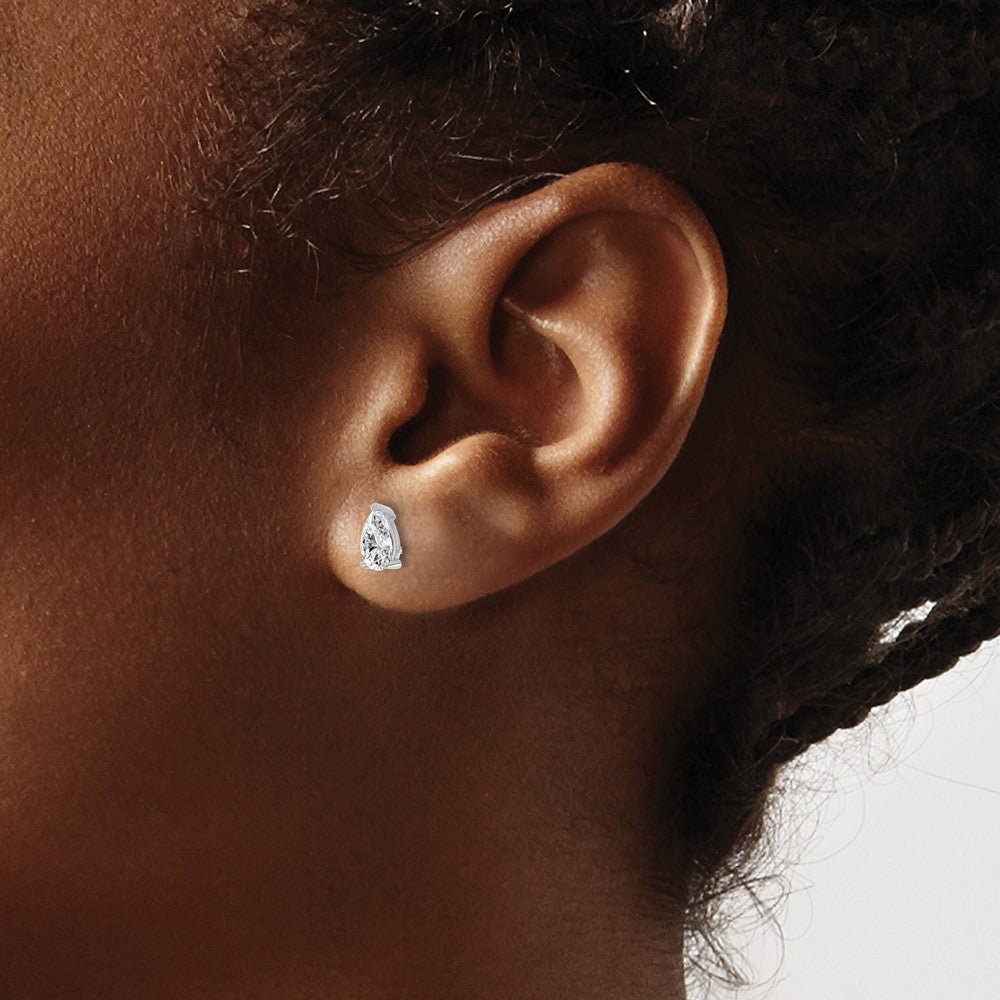 Discover the stunning 14K white gold 2/3 Ctw lab-grown diamond Vs+ F+ pear-shaped stud earrings. These elegant earrings feature two bright white diamonds, each 5.85x3.8 mm, securely held in a sturdy 3-prong setting. The polished white gold finish adds a sleek shine, while the lab-grown diamonds offer exceptional clarity and sparkle at a great value. With a weight of 0.33 carats, they are perfect for everyday wear or special occasions. The solid design and secure post and push back closures make these earrings a true treasure. The 14K white gold 2/3 Ctw lab-grown diamond Vs+ F+ pear earrings will elevate your jewelry collection with charm and style.