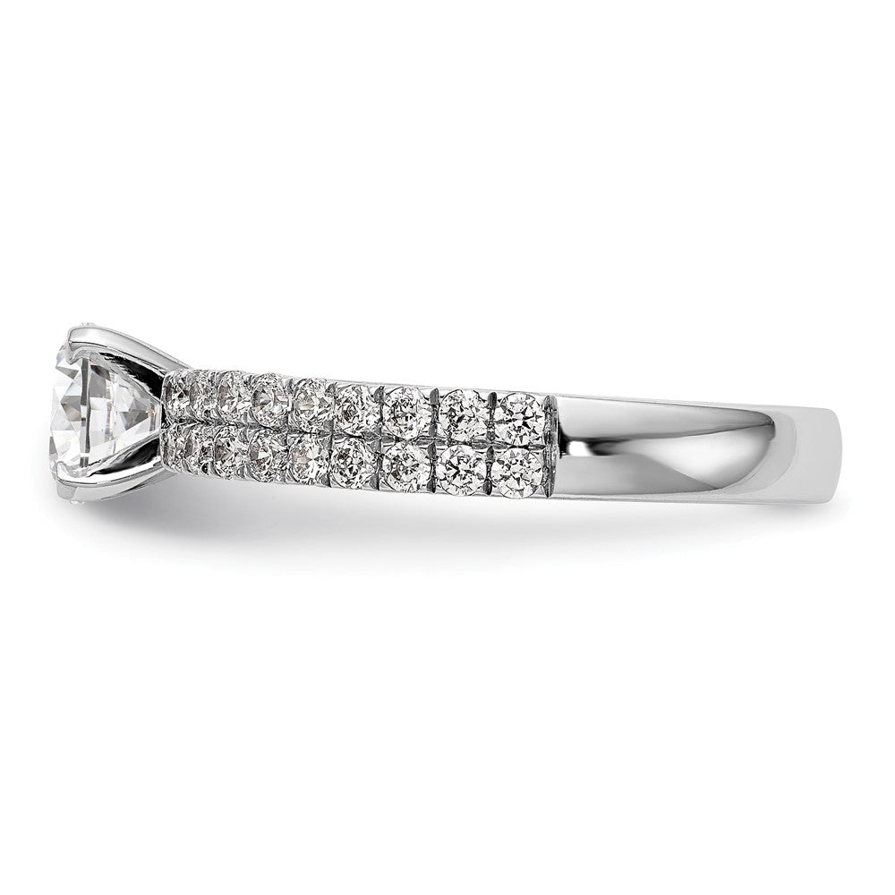 The 14K White Gold 2-Row Peg Set 3/4 Carat Diamond Semi-Mount Engagement Ring makes love shine bright. Crafted from polished 14K white gold, this ring features a stunning 0.75-carat round center setting ready for your favorite stone. It’s paired with 36 sparkling pavé-set diamonds that add extra dazzle. The ring’s tapered band adjusts from 15.3 to 7.3 mm for a perfect fit, with a height of 10.7 mm. Designed for comfort and style, the ring’s semi-mount shape makes it easy to add your dream diamond later. The bold look of the 14K White Gold 2-Row Peg Set 3/4 Carat Diamond Semi-Mount Engagement Ring is sure to wow.