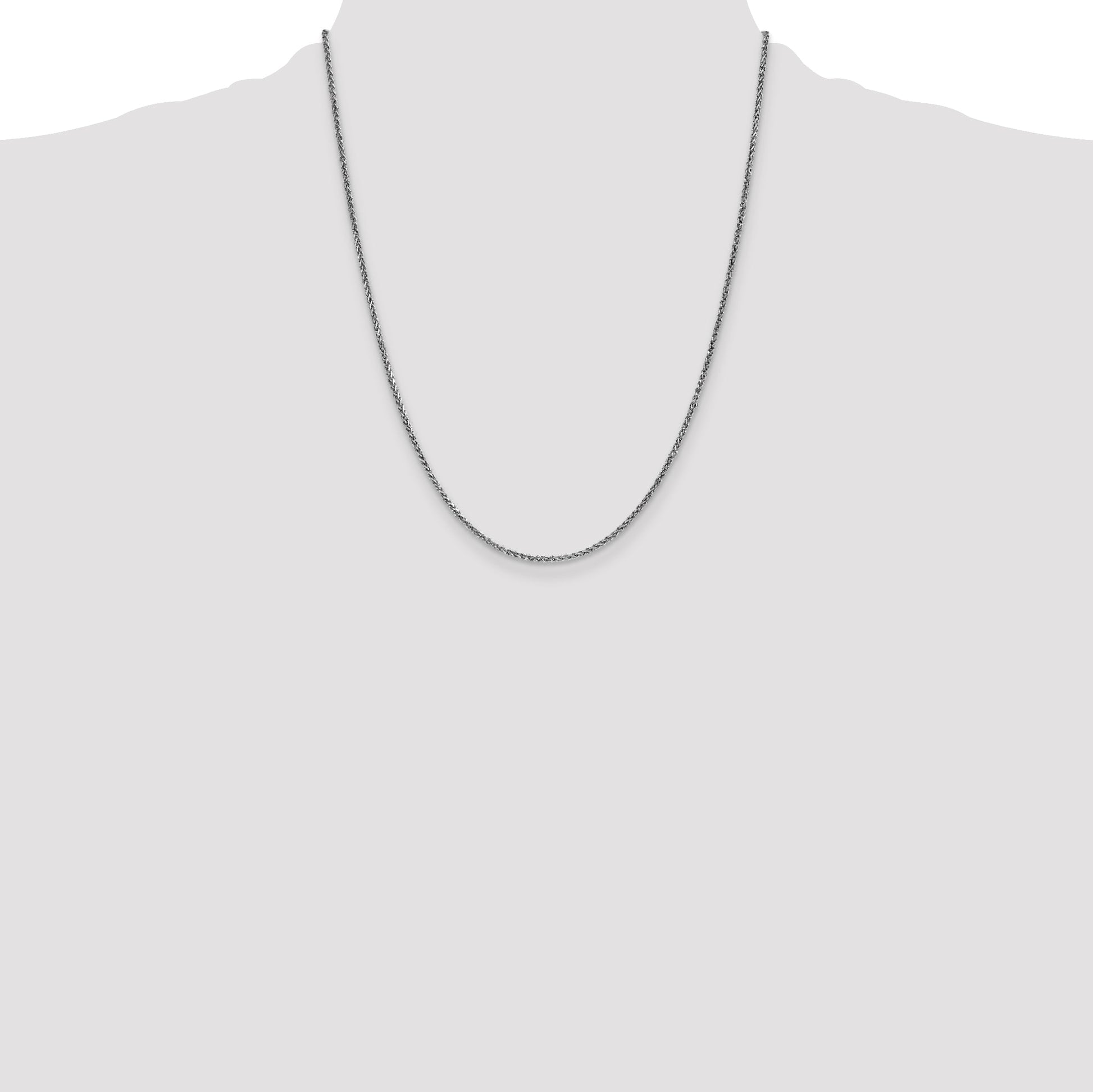 The 14K White Gold 22 Inch 1.7mm Diamond-Cut Spiga with Lobster Clasp Chain is a stunning piece of jewelry for every occasion. Crafted from pure 14K gold, this polished chain has a sleek white color. The rhodium plating gives it extra shine and protects the surface. At 22 inches long and 1.7mm wide, the Spiga, or wheat design, stands out with its eye-catching diamond-cut texture. The secure lobster clasp ensures this chain stays in place. This 14K White Gold chain is ideal for those who value elegance.
