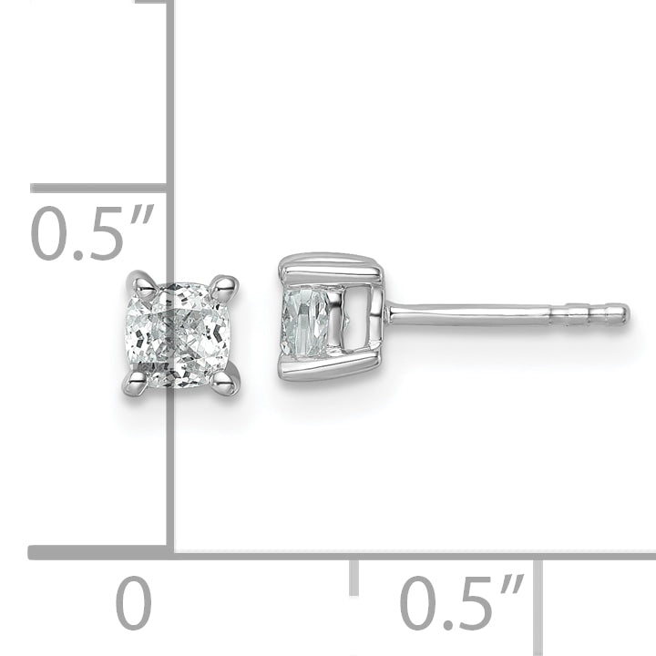 These stunning 14k White Gold Stud Earrings will effortlessly elevate any ensemble. Featuring 3/4 carat total weight of lab-grown diamonds, each earring showcases a brilliant cushion cut with exceptional clarity ranging from VS to SI+. The diamonds, in a classic four-prong setting, offer a timeless elegance perfect for any occasion. The 14k white gold adds a polished, sophisticated touch, enhanced by rhodium plating to ensure enduring shine. These earrings provide a secure post and push back closure for comfortable wear. Discover the perfect blend of beauty and ethically sourced luxury with the 14k White Gold Diamond Stud Earrings.