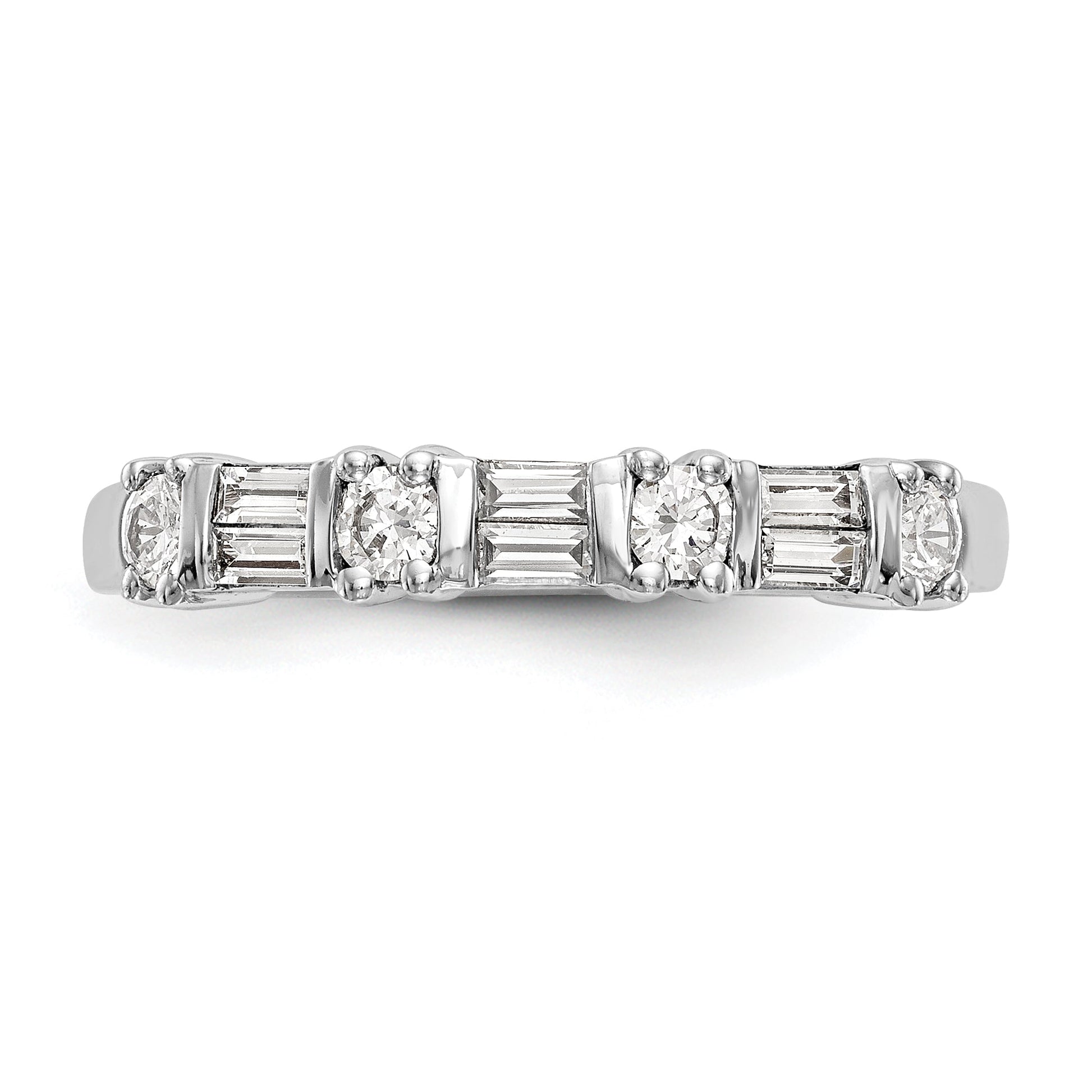 Meet the 14K White Gold 14K 3/8 Carat Baguette/Round Diamond Complete Wedding Band, a shining symbol of love. Crafted from pure 14K white gold with a polished finish, this band features six natural diamonds, including sparkling round and sleek baguette shapes. The stones weigh a total of 0.0889 carats and add just the right touch of brilliance. With a tapered design, the band flows smoothly from 2.7 to 1.8 mm wide, fitting comfortably. The solid cast build ensures durability. The 14K White Gold 14K 3/8 Carat Baguette/Round Diamond Wedding Band is the perfect choice for a timeless, elegant vow.