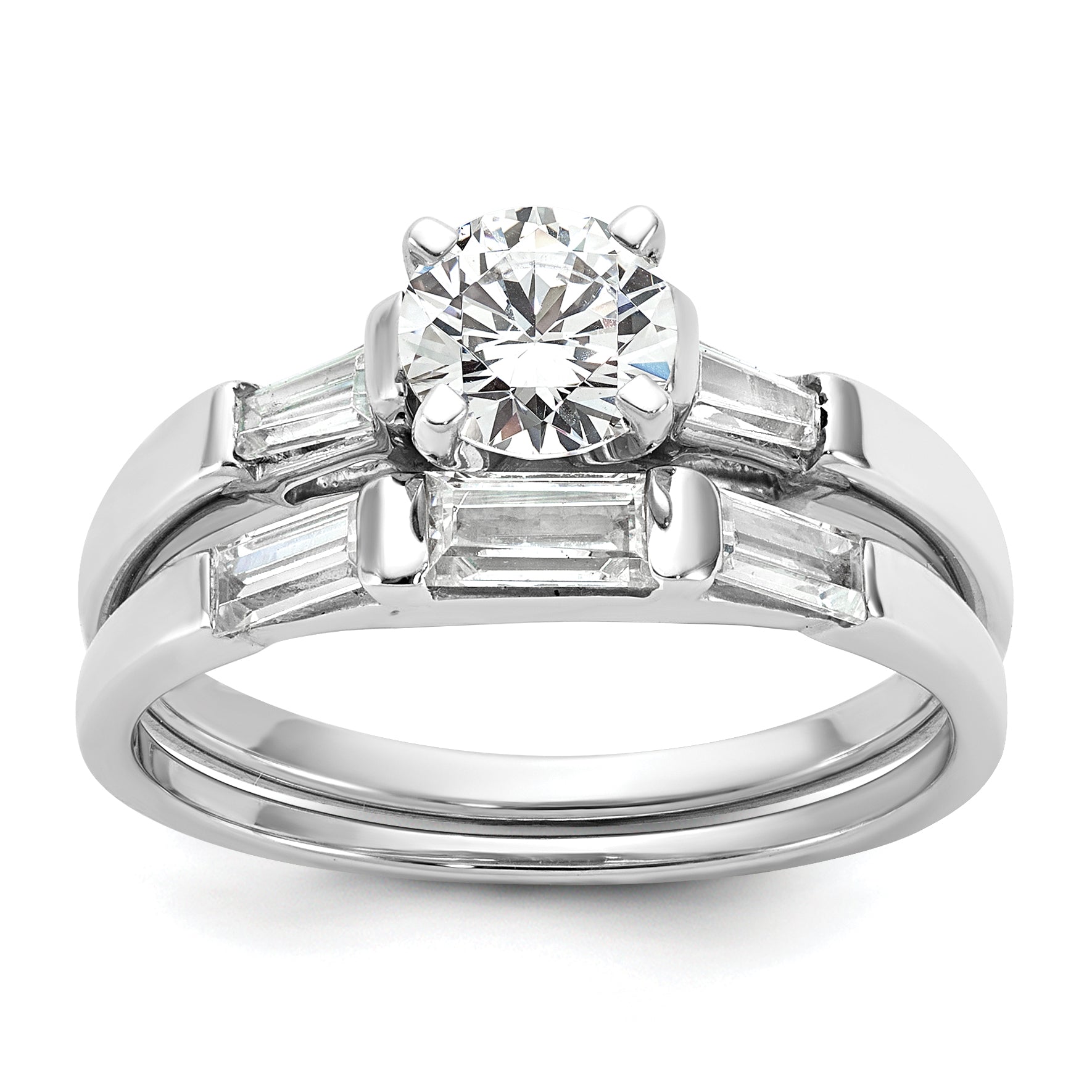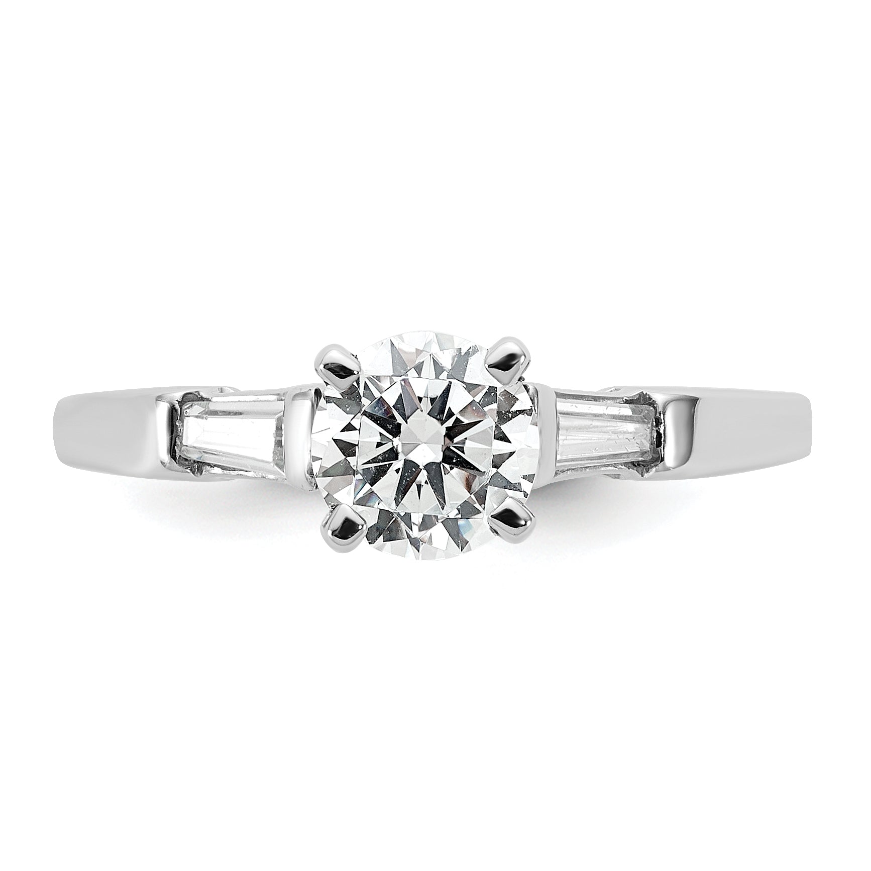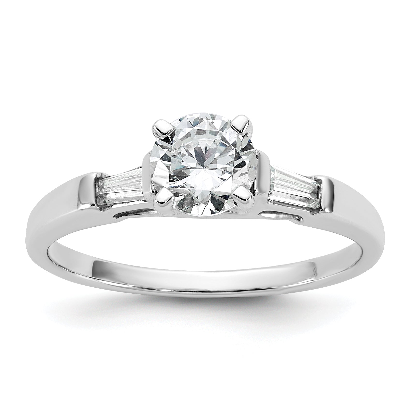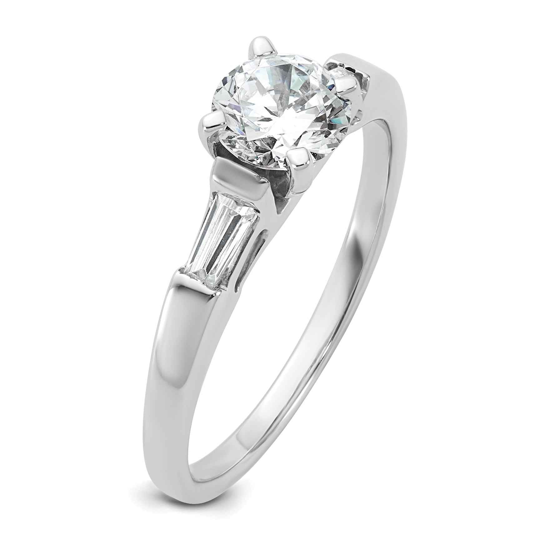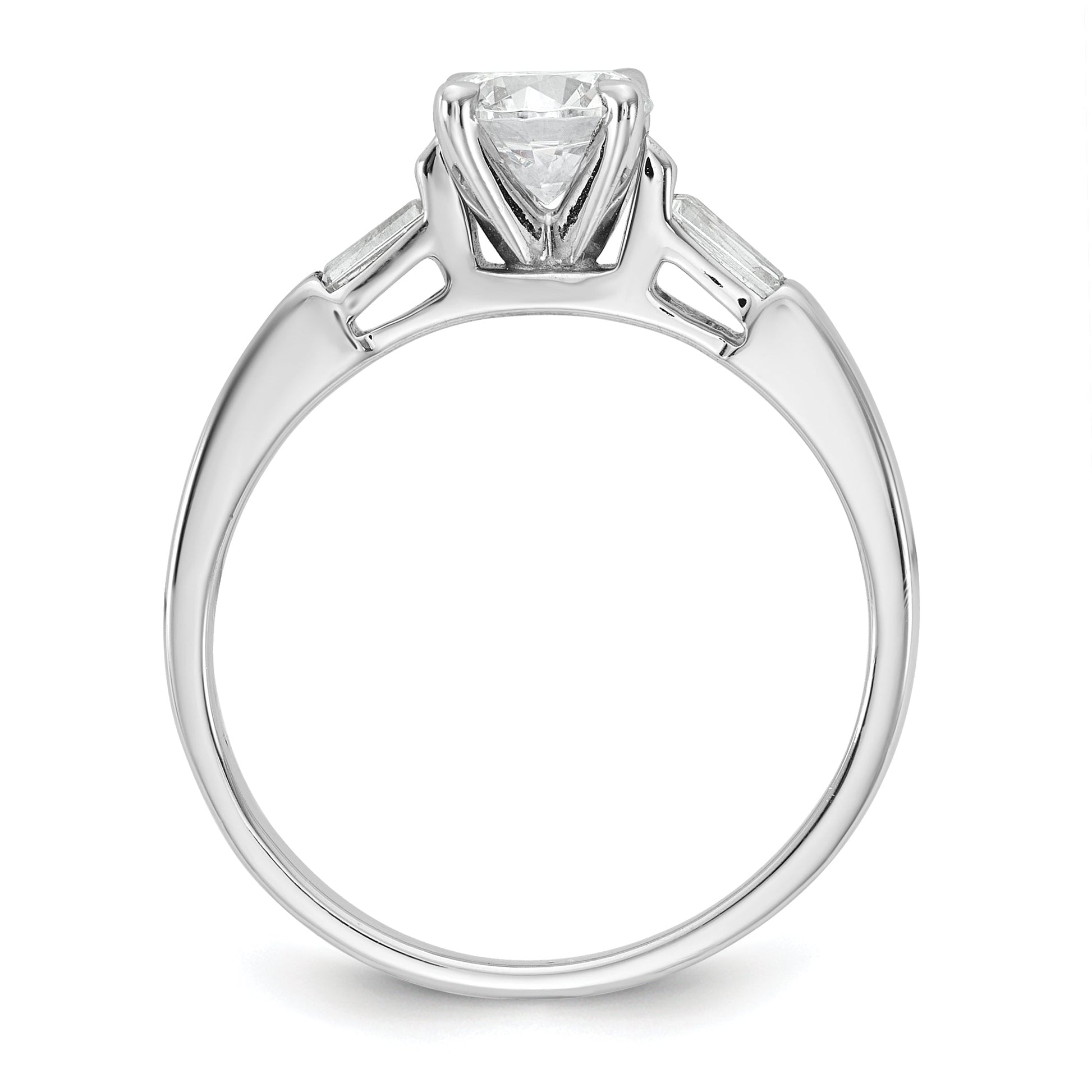 The 14K White Gold 14K 3-Stone Diamond Peg Set offers a stunning look for any engagement ring. Crafted from polished 14K white gold, it features a bold 0.75-carat round center stone flanked by two baguette side stones of 0.08 carats each. The set is finished with a rhodium plating for a bright shine and a sturdy, solid feel. Its tapered band, ranging from 1.59 to 1.95 mm wide, offers a sleek fit, while the semi-mount design allows for easy resizing. The ring’s classic shape combines with natural diamonds to create an elegant, timeless piece—perfect for marking special moments with style.
