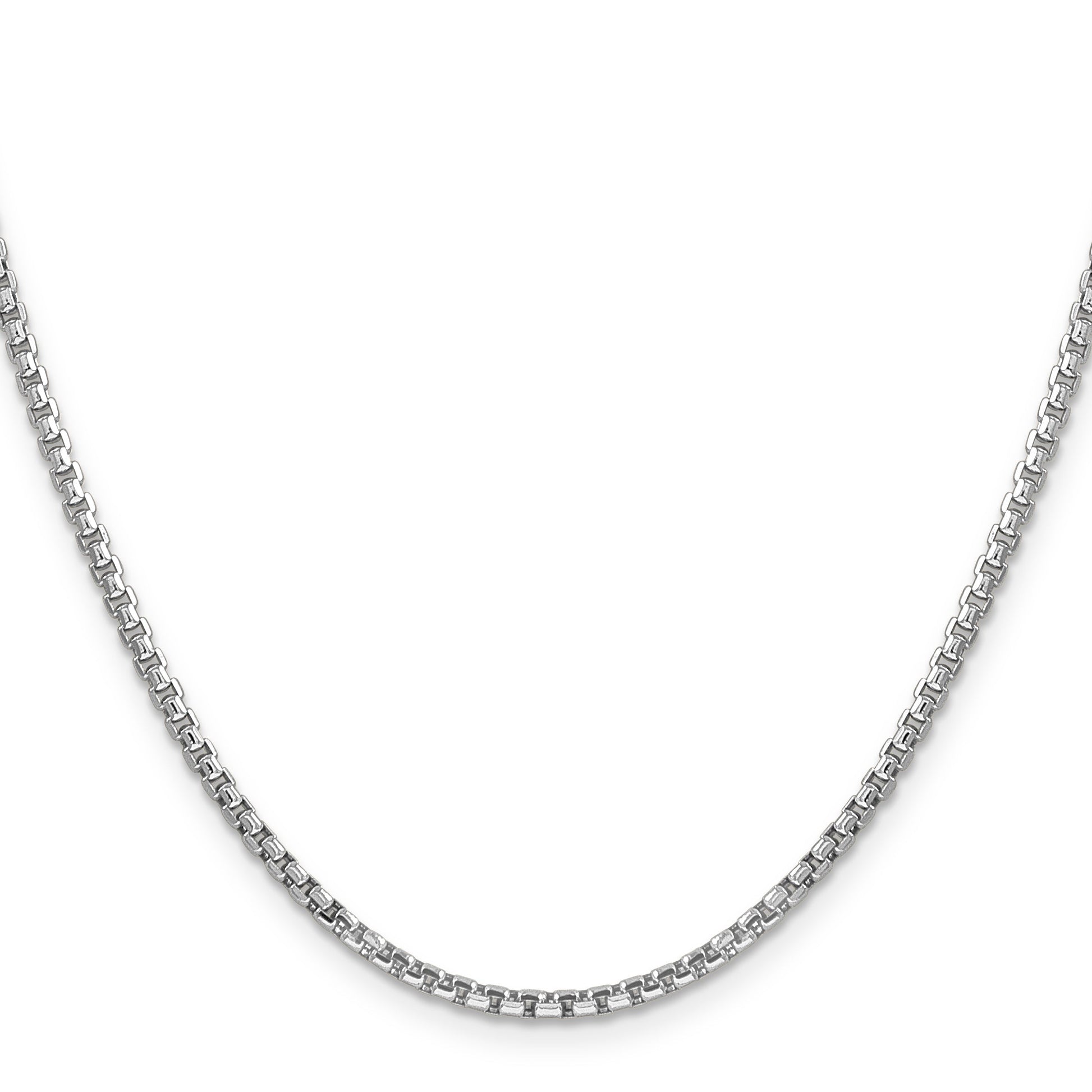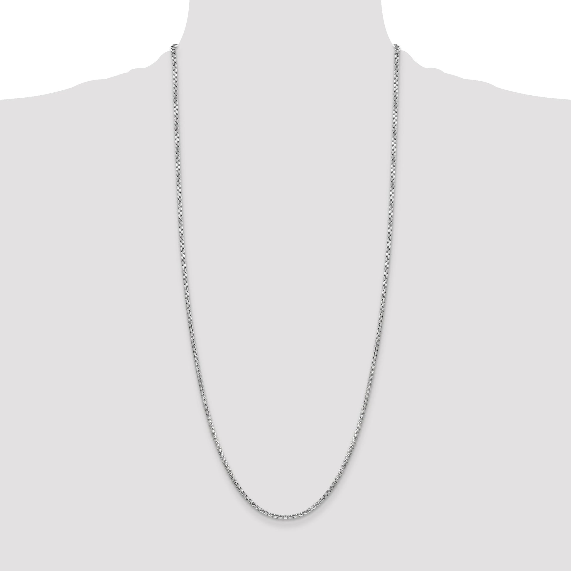 Introducing the 14K White Gold 30 Inch Semi-Solid Round Box Chain with Lobster Clasp. This polished chain, with a rich rhodium plating, gleams with brilliance. Its 2.45mm width offers a perfect balance of strength and elegance. The 30-inch length makes it ideal for layering or solo wear. The sturdy lobster clasp ensures a secure fit, adding to its comfort. Crafted from high-quality 14K gold, this chain blends durability with style. Elevate any outfit with the timeless sophistication of the 14K White Gold 30 Inch Semi-Solid Round Box Chain with Lobster Clasp.