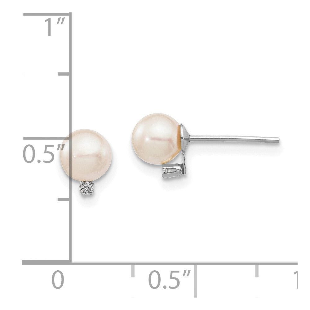 Elevate your style with the 14K White Gold 5-6mm Round Akoya Saltwater and .02 Carat Diamond Earrings. Crafted from bright 14K white gold, these earrings feature lustrous Akoya pearls that measure 5 to 6 mm, paired with sparkling diamonds for a stunning touch. The jewelry boasts a polished finish and rhodium plating that adds durability and shine. With a classic ball shape and secure friction backs, they’re simple to wear daily or for special occasions. The combination of real cultured pearls and genuine diamonds makes the 14K White Gold 5-6mm Round Akoya Saltwater and .02 Carat Diamond Earrings a chic addition to any woman's jewelry collection.