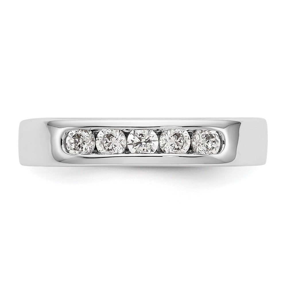 Discover the 14K White Gold 14K 5-Stone 1/3 Carat Round Diamond Complete Channel Band, a perfect blend of elegance and durability. This stunning ring features five natural white diamonds, each faceted and set securely in a sleek channel design. With a total weight of 0.07 carats, the diamonds shine with a bright G-H-I color grade and I1 clarity. Crafted from solid 14K white gold, the ring showcases a polished finish and a slim 3.6 mm band. Fully complete with all stones included, this wedding band is versatile, adjustable in size from 6 to 8, and offers a timeless look for your special day.