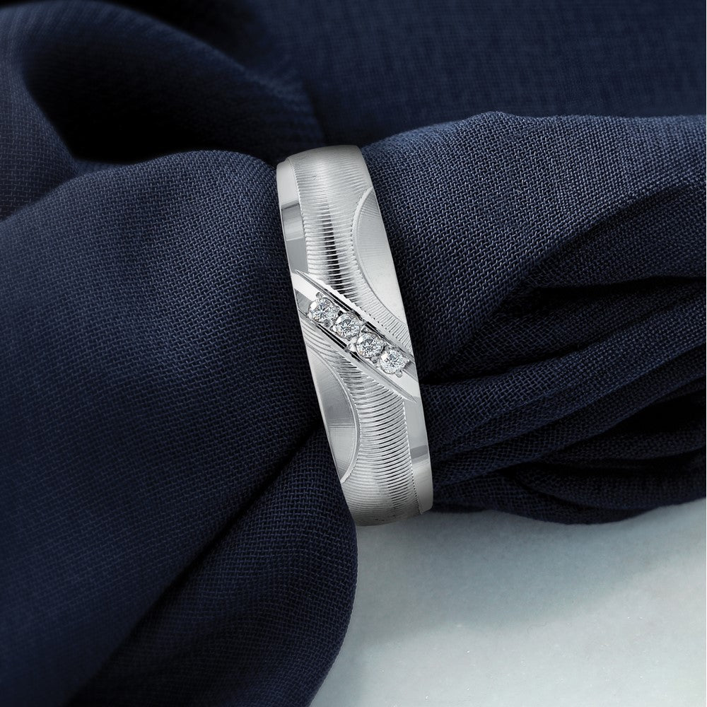 Check out the 14K White Gold Aa Quality 1/20 Carat Diamond Trio Mens Wedding Band. Crafted in shiny 14K white gold, this ring has four bright diamonds that add a touch of class. The diamonds are round-cut, clear, and sparkle with a 1.3 mm size. Rhodium plating keeps the shine bright and resists tarnish. Lightweight and durable, this wedding band combines style and strength perfect for any groom. With its natural stones and elegant design, the 14K White Gold Aa Quality 1/20 Carat Diamond Trio Mens Wedding Band makes a bold statement of love and commitment.