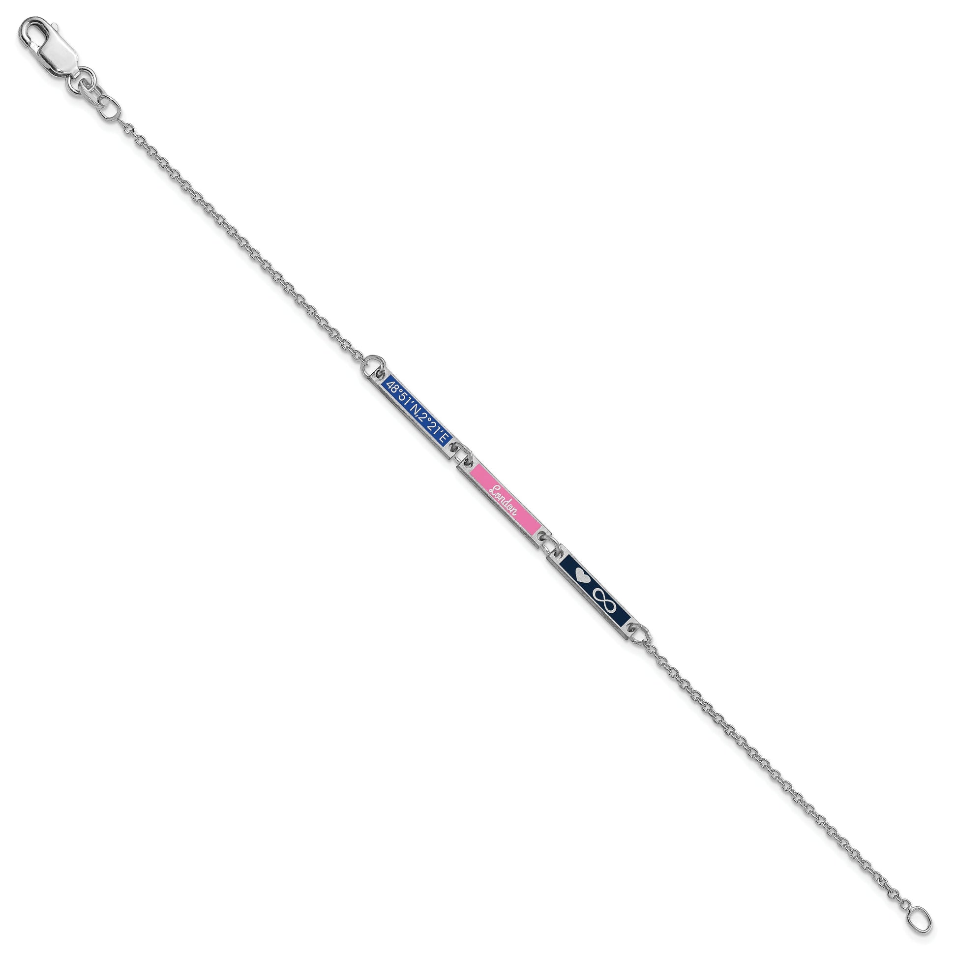 The 14K White Gold Brushed 3 Station W/Epoxy Bracelet is a sleek piece that adds a touch of elegance to any woman's look. It features a modern brushed finish with three stations accented by colorful enamel, making it standout. The bracelet is 7 inches long, with a durable cable chain and a secure lobster clasp. Its personalized bar charm measures nearly 15mm wide, giving it a unique touch. Made of high-quality 14K gold with rhodium plating, this jewelry piece combines style and durability. The 14K White Gold Brushed 3 Station W/Epoxy Bracelet is perfect for everyday wear or special occasions.