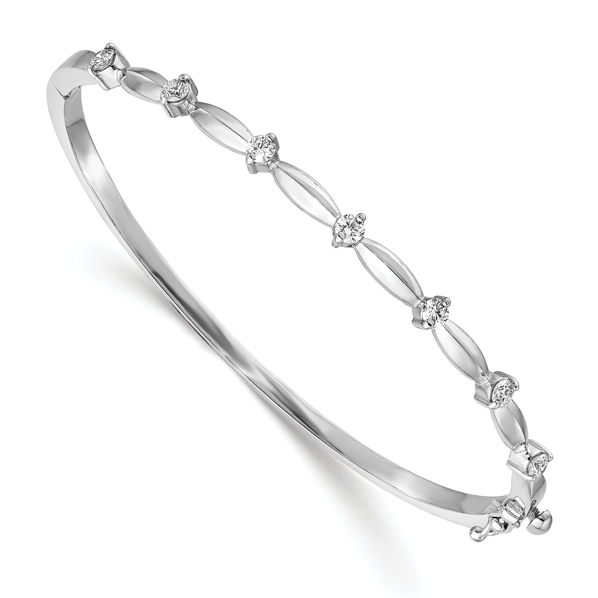 The 14K White Gold Complete 1/2 Carat AAA Diamond Hinged Oval Bangle Bracelet offers a chic and elegant look. Crafted from shiny 14K white gold, this bracelet features seven sparkling round diamonds with a total weight of 0.07 carats. The diamonds are set in a sturdy prong setting and have clear, bright G-I color and SI2/SI3 clarity. With a comfortable 7-inch length and secure hinged clasp, this bracelet stays put. The smooth, polished finish enhances its refined appeal. Perfect for women who want a bold yet classy bracelet, the 14K White Gold Complete 1/2 Carat AAA Diamond Hinged Oval Bangle Bracelet is a true showstopper.