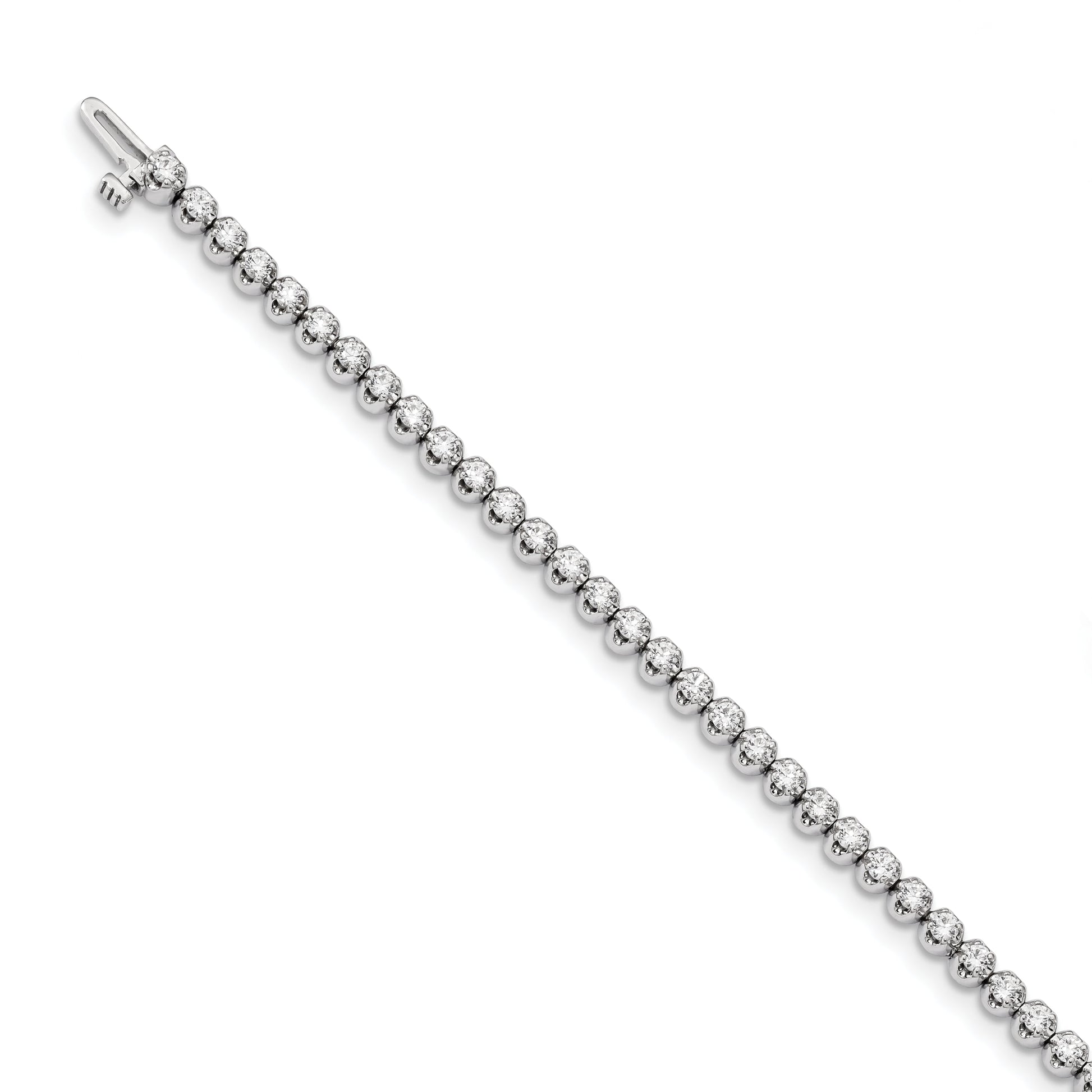 The 14K White Gold Complete 2.09 Carat Round AA Diamond 4-Prong 7 Inch Tennis Bracelet is a stunning piece of jewelry for women. Crafted from polished 14K white gold, it features 51 natural diamonds with a total weight of 2.09 carats. Each round diamond is securely set in a classic four-prong style for added shine. Measuring 7 inches long, this solid bracelet has a sleek 3.5 mm width and a box catch for reliable wear. Designed to dazzle, the bracelet combines fine craftsmanship with timeless elegance, making it a perfect choice for any special occasion.