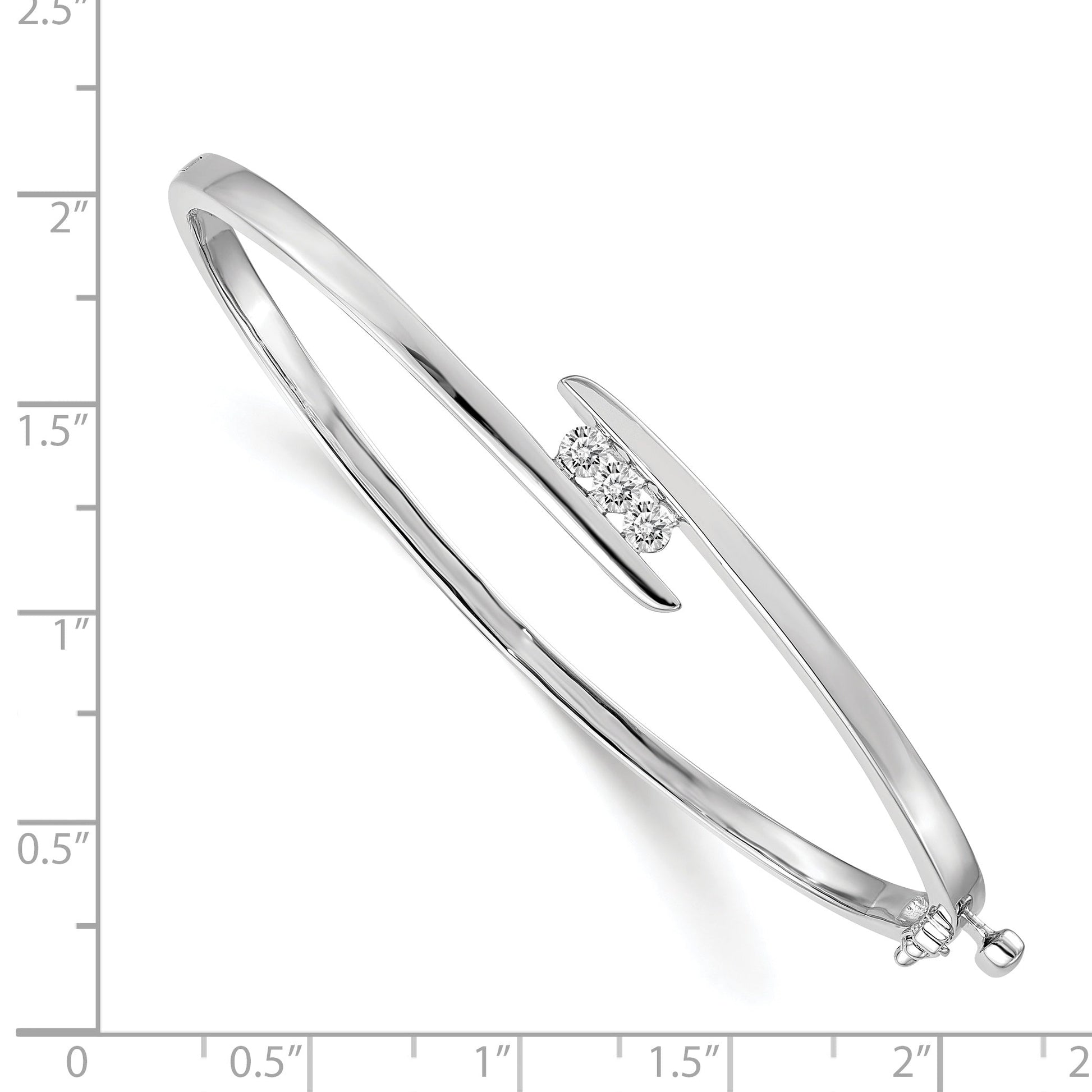 Meet the stunning 14K White Gold Complete 3-Stone 1/3 Carat AA Diamond Hinged Oval Bangle Bracelet. This elegant piece features three sparkling white diamonds set in a polished, solid gold design. The diamonds are beautifully cut with a faceted round shape, adding a touch of shimmer. A hinged clasp makes it easy to wear and secure. With a sleek 7-inch length and a 6mm width, this bracelet offers a perfect fit for women. The white gold finish and rhodium plating give it a bright, polished look that lasts. Own the charm of April's birthstone with this timeless jewelry piece.