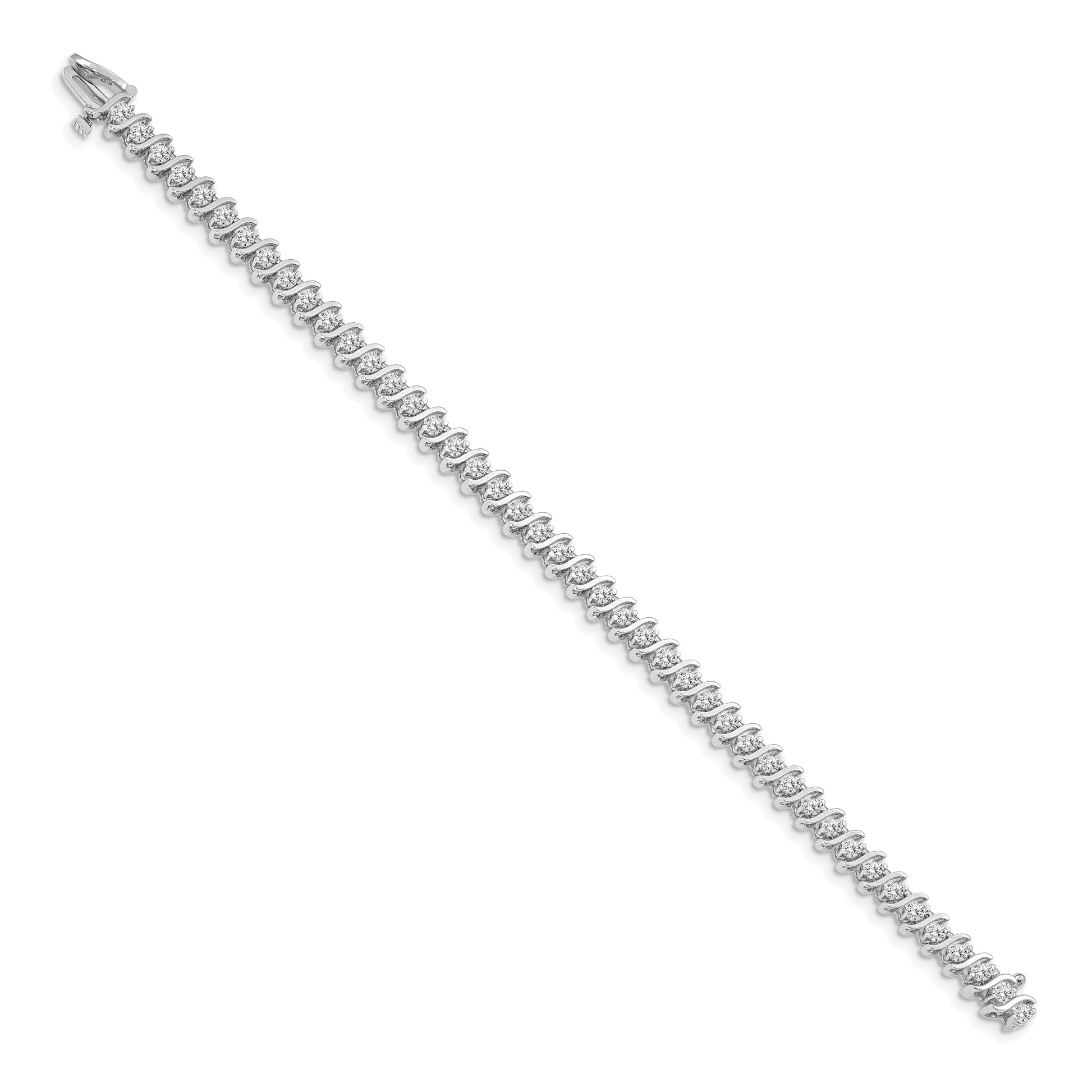 The 14K White Gold Complete 3.08 Carat Round AA Diamond 2-Prong S-Link 7 Inch Tennis Bracelet is a stunning piece that adds shine to any look. Crafted from solid 14K white gold and set with 44 sparkling diamonds, this bracelet offers a sleek, elegant design. The diamonds are carefully prong-set for a secure fit and radiant sparkle. With a length of 7 inches, it comfortably adorns the wrist. Perfect for special occasions or everyday wear, the bracelet features a box catch for secure closure. The 14K White Gold Complete 3.08 Carat Round AA Diamond tennis bracelet blends style and durability effortlessly.