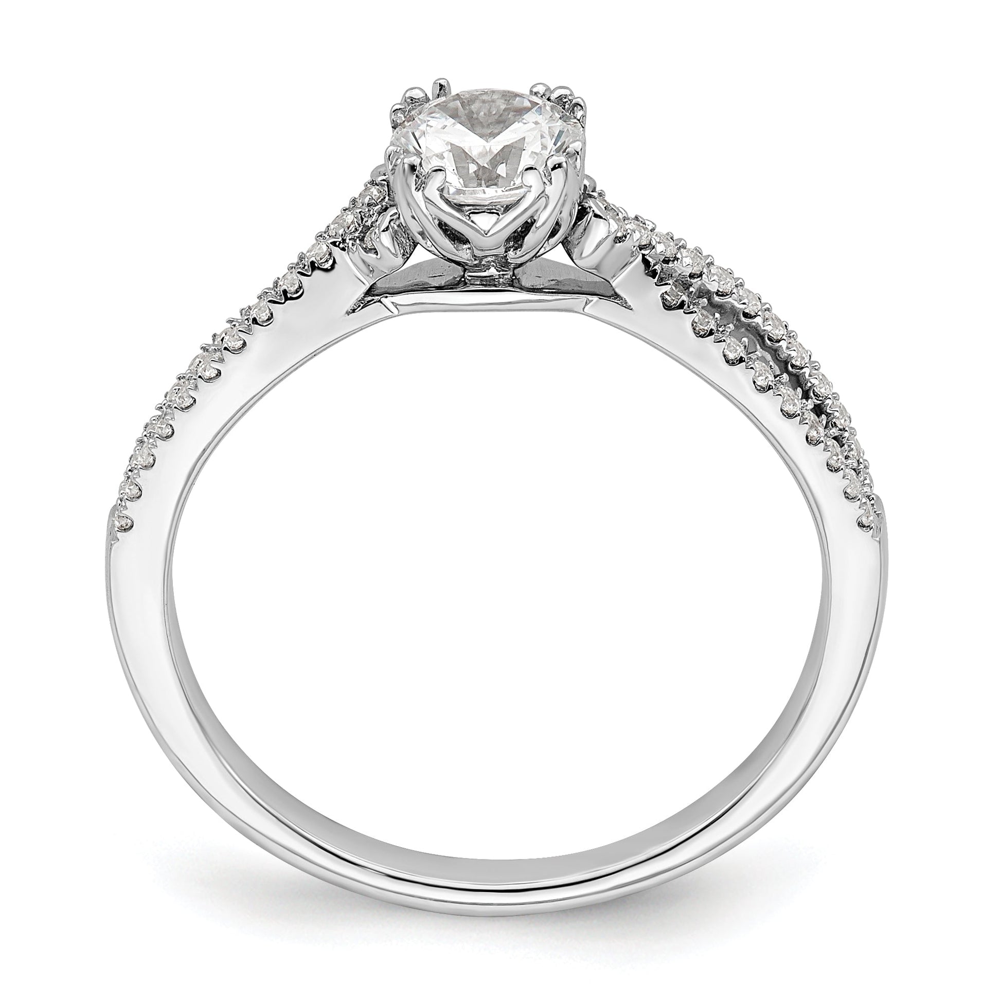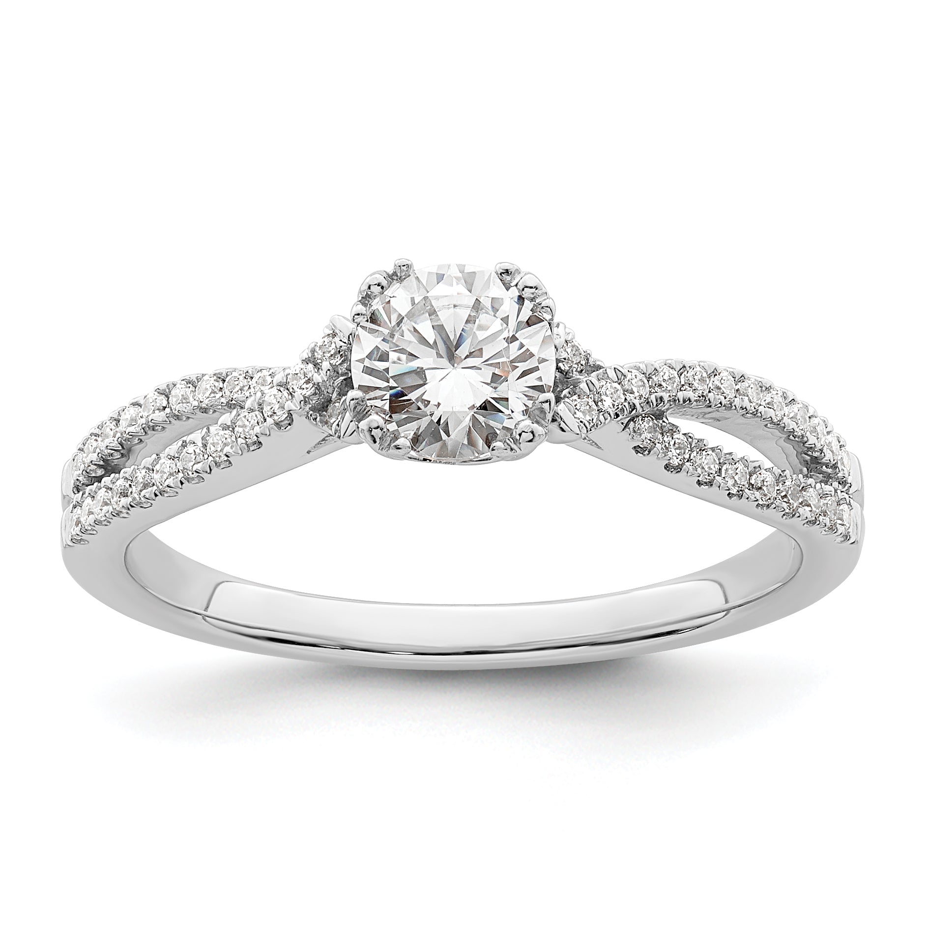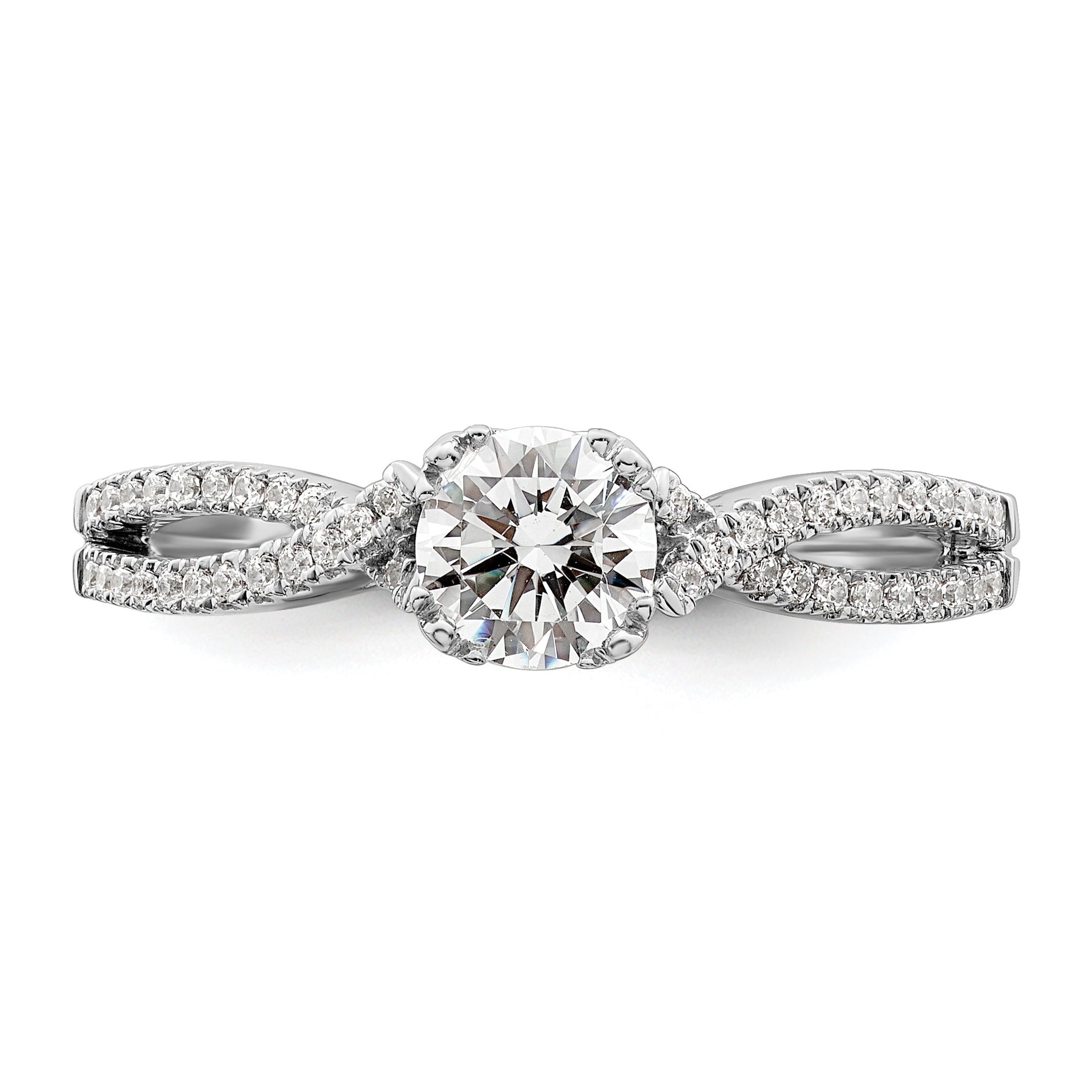 The 14K White Gold Criss-Cross Semi-Mount Engagement Ring is a stunning choice for your special moment. Its sleek, polished design features a unique criss-cross pattern that adds a modern twist. The ring is crafted from solid 14K white gold and is rhodium-plated for shine and durability. It holds a 1/2 carat round center stone, with 44 small diamonds set in a prong style along the band. The tapered band measures from 1.7 to 3.4 mm wide, giving it an elegant look. This semi-mount ring is just waiting for the perfect center stone to complete your engagement.