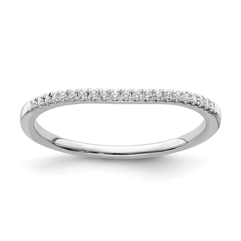 This beautiful wedding band is made of solid 14k white gold and features a contoured design to perfectly complement your engagement ring. It is adorned with 21 sparkling genuine diamonds, each measuring 1mm in size and weighing 0.005 carats, for a total weight of 0.105 carats. The band is 1.5mm wide and has a polished finish. It is rhodium plated for added durability and shine. This ring is a complete piece of jewelry, with all stones included, and is sizeable to ensure a perfect fit. The round stones are natural in shape and created using a natural stone creation method. This ring is sold individually and is the perfect choice for anyone looking for a stunning wedding band.