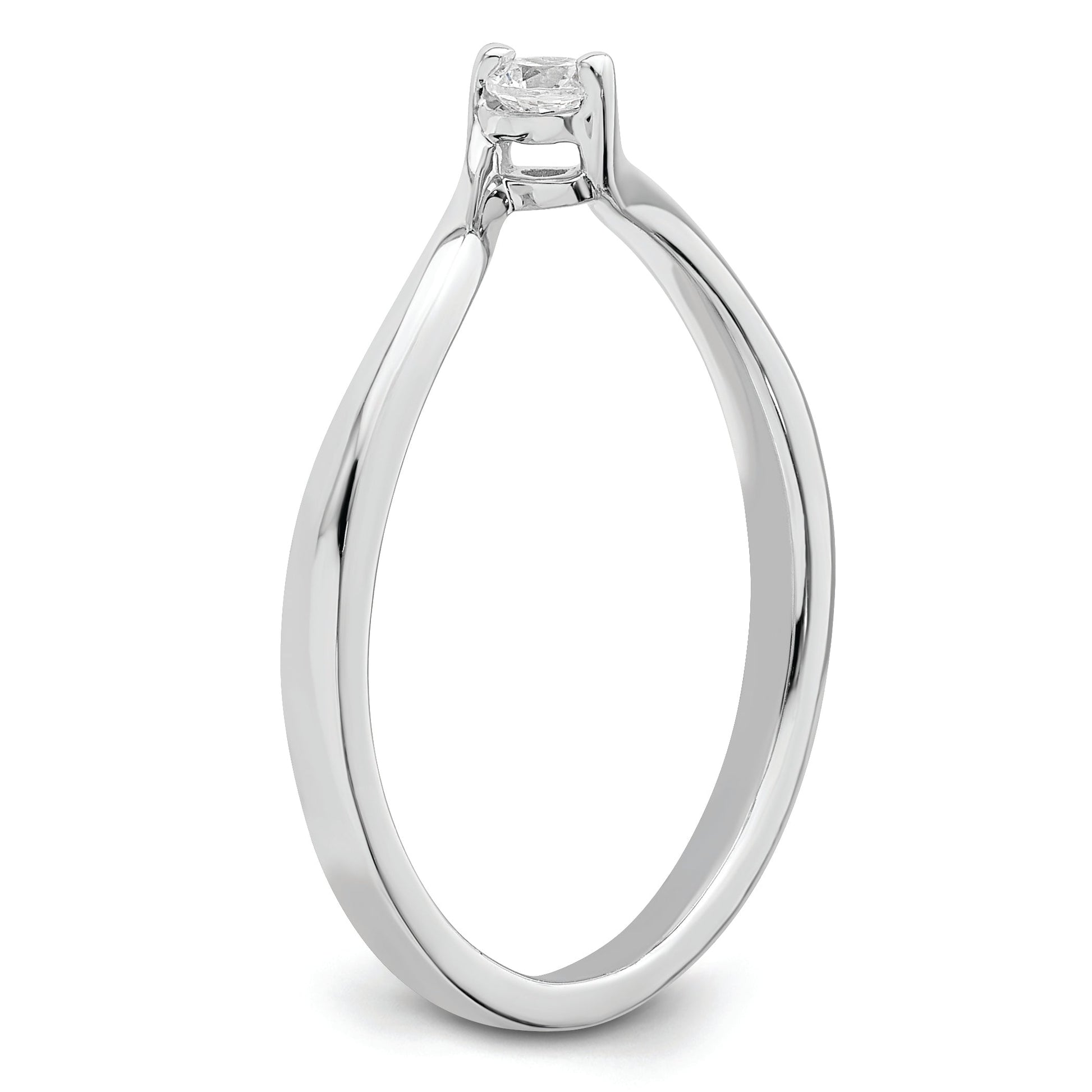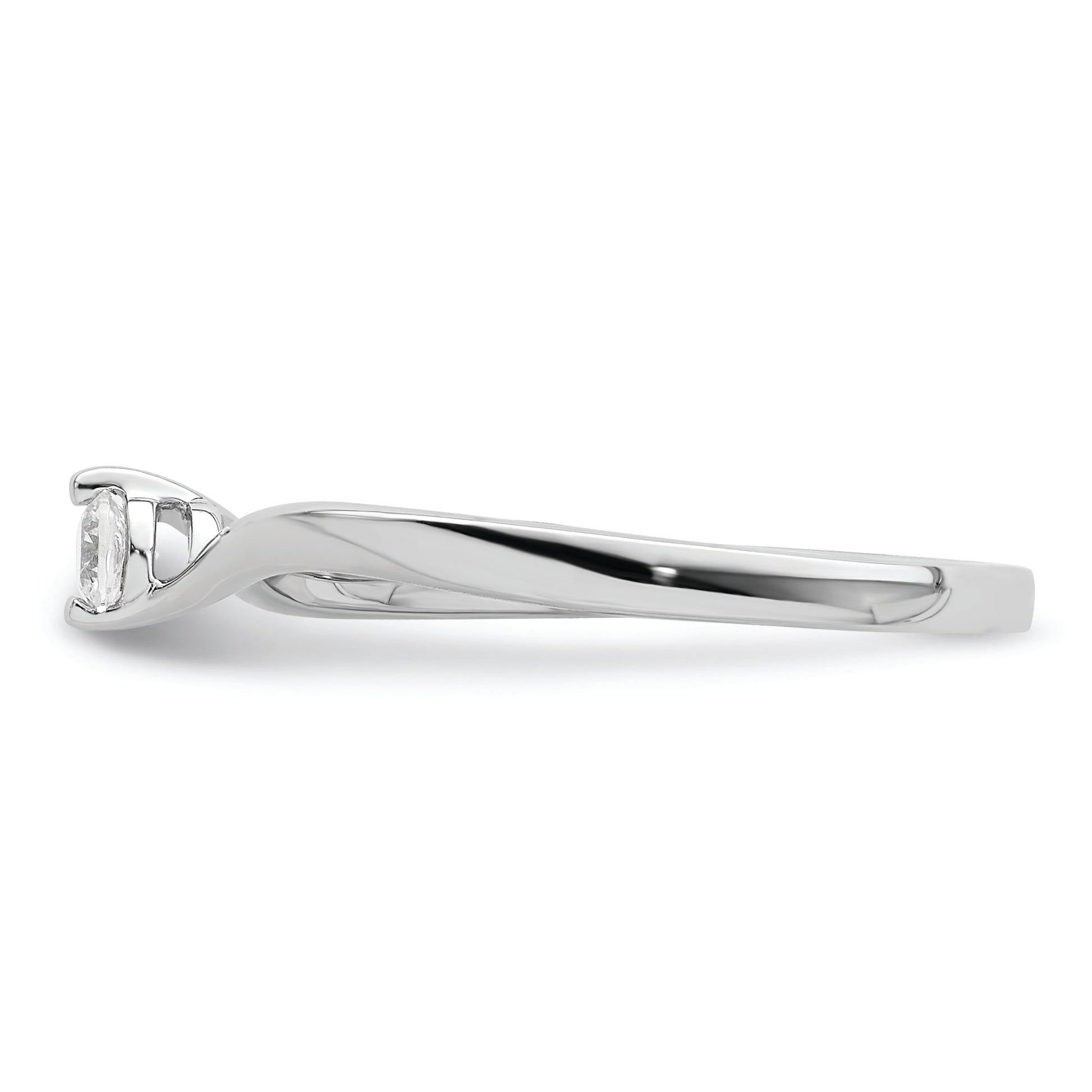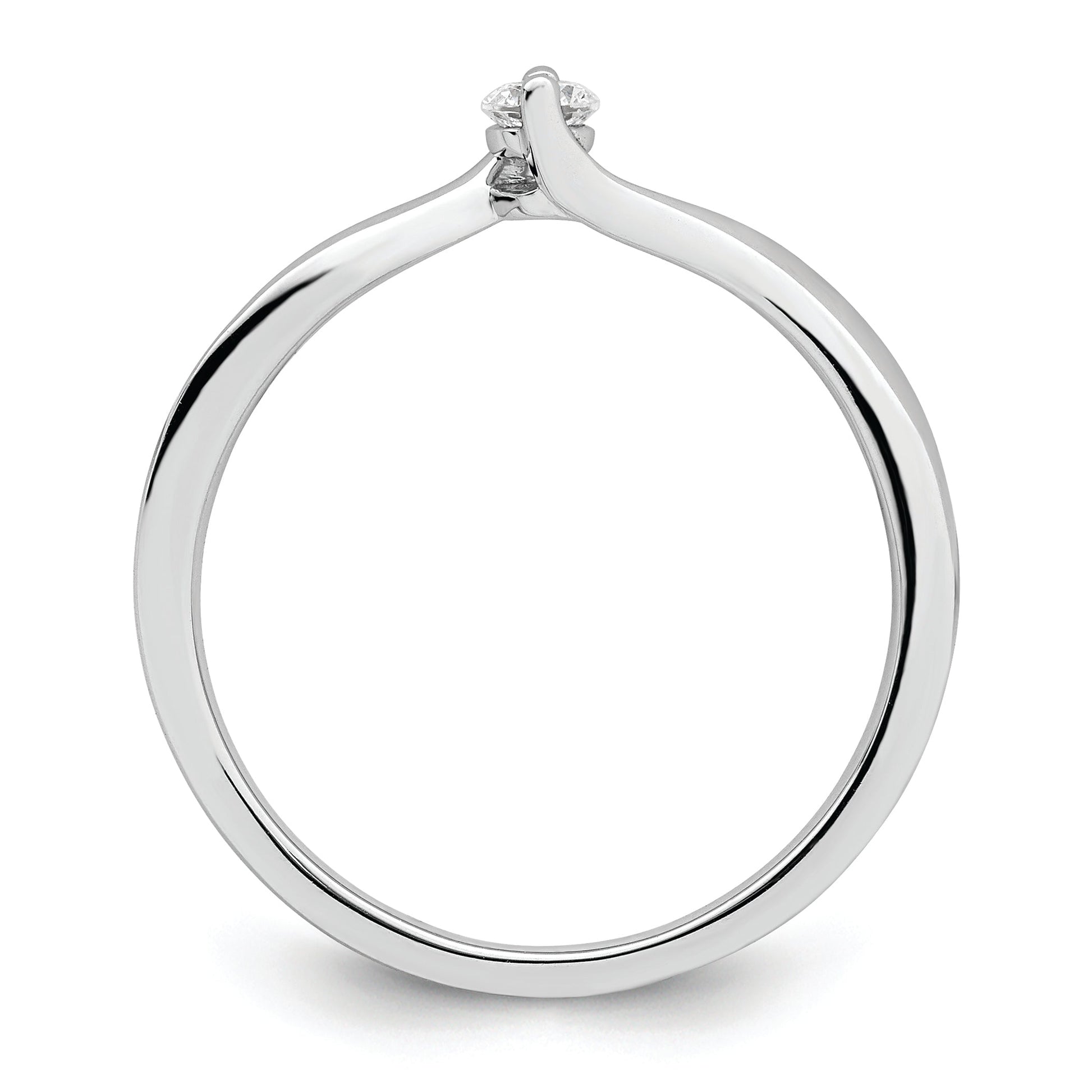 The 14K White Gold First Promise Bypass Ring is a beautiful choice for an engagement or promise ring. This piece features a sparkling 0.1-carat round diamond securely prong-set in polished, rhodium-plated white gold. The band tapers from 1.6 to 1.9 mm and is crafted with a solid, cast finish, making it both durable and elegant. Its sleek design offers a perfect fit for women, with sizes ranging from 6 to 8. The First Promise Bypass Ring combines timeless style with quality craftsmanship, making it a meaningful symbol of love.