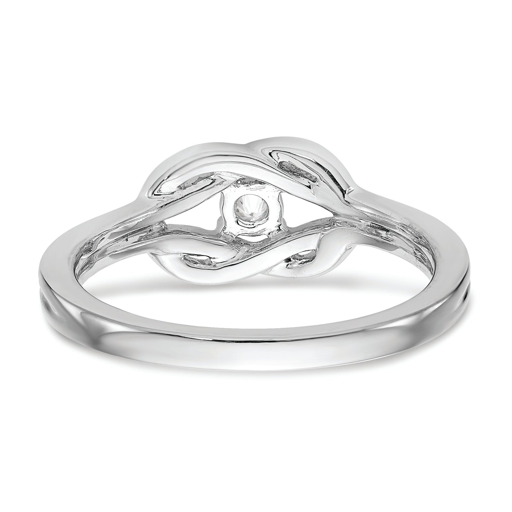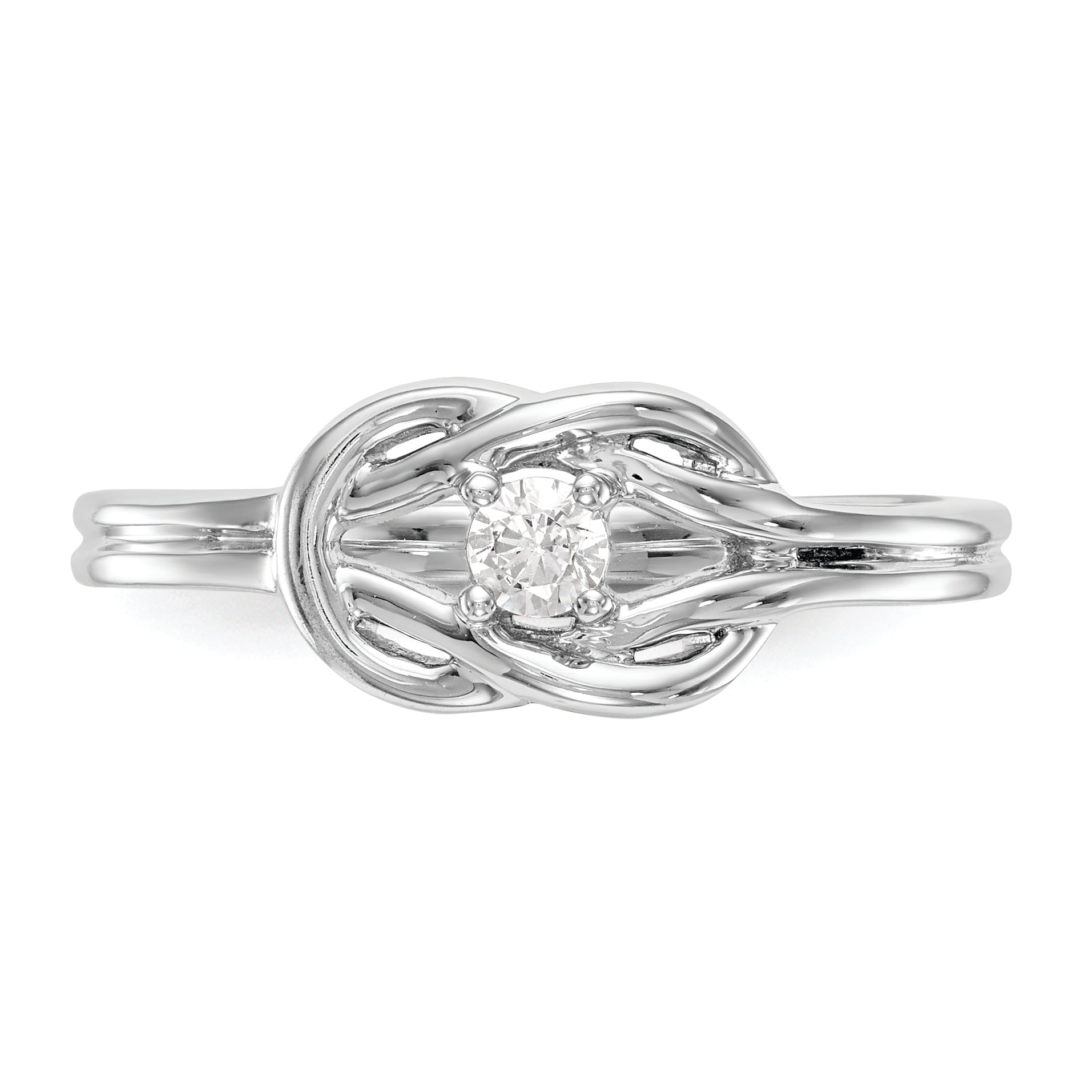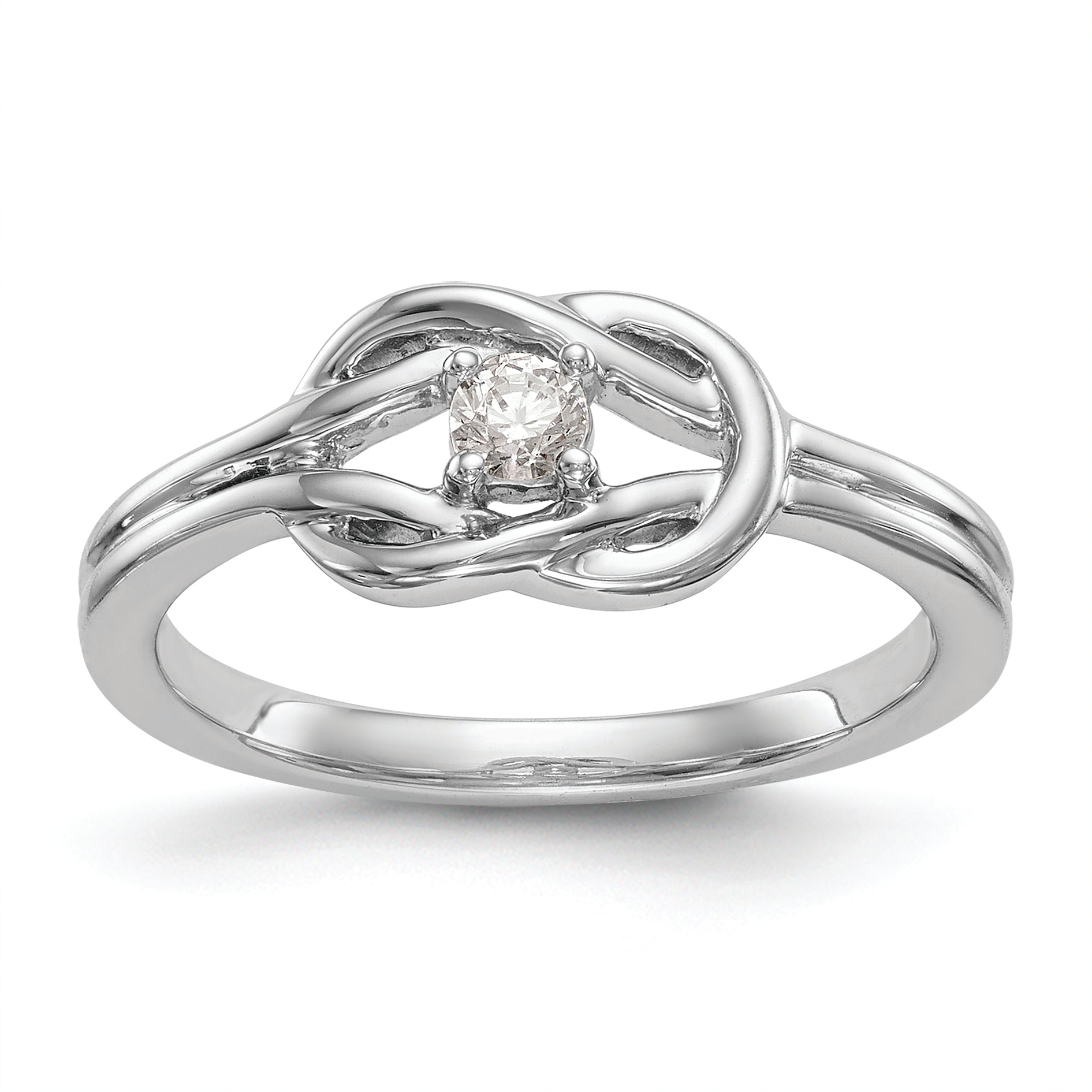The 14K White Gold First Promise Love Knot Ring is a stunning choice for your special moment. Crafted from bright, polished white gold, this ring features a delicate love knot design symbolizing unity and love. A sparkling 3mm round diamond, with a total weight of 1/8 carat, adds an elegant touch. The open back design offers a comfortable fit, while the ring's solid build ensures durability. Perfect for engagement, the First Promise Love Knot Ring combines style with meaning, making it an ideal way to celebrate your commitment.
