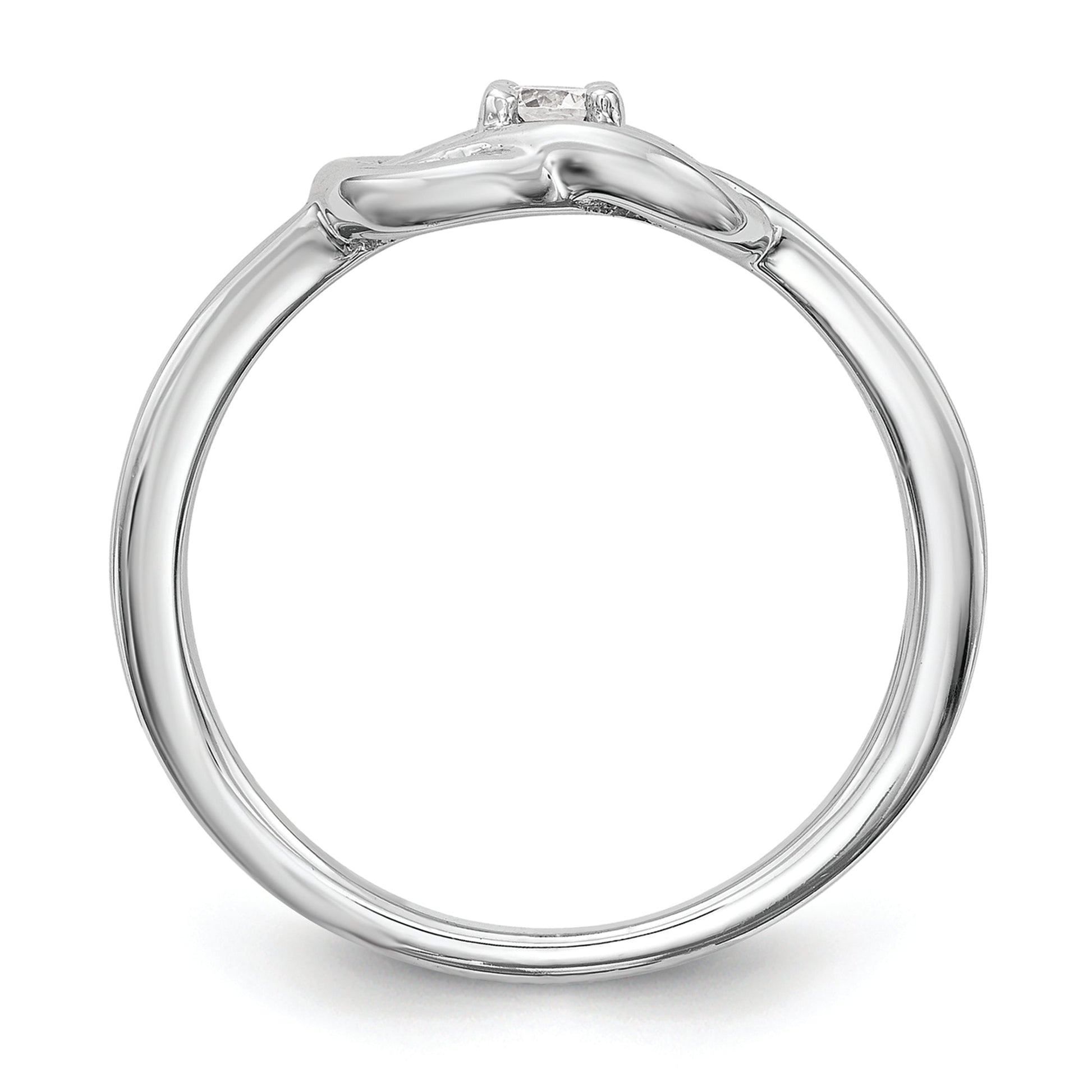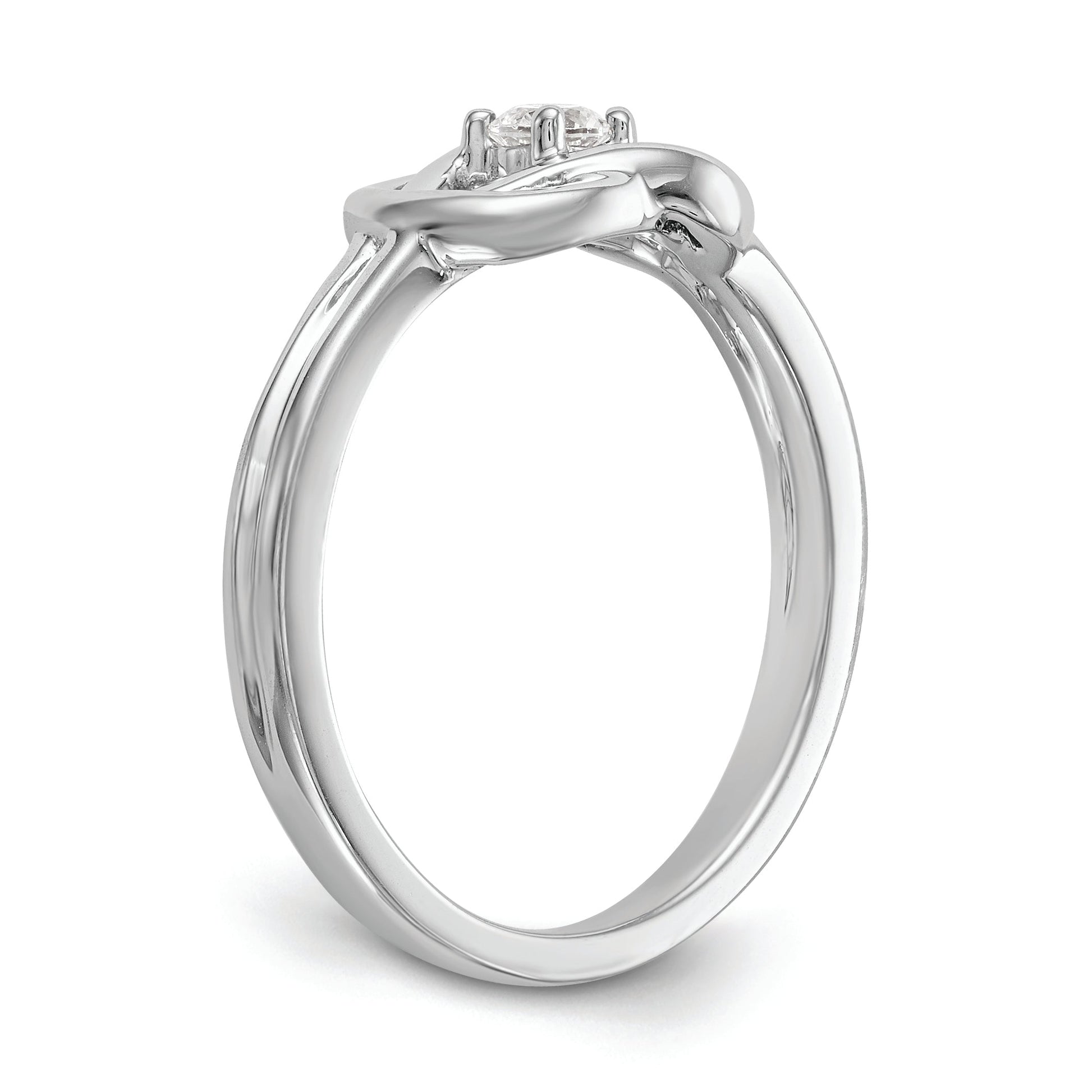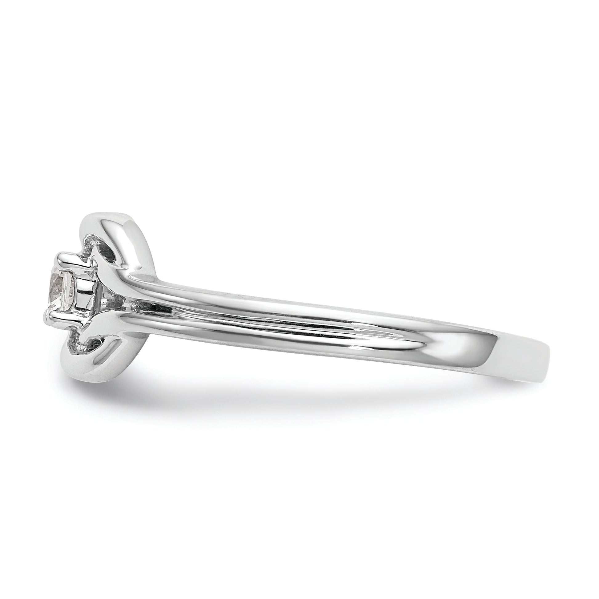 The 14K White Gold First Promise Love Knot Ring is a stunning choice for your special moment. Crafted from bright, polished white gold, this ring features a delicate love knot design symbolizing unity and love. A sparkling 3mm round diamond, with a total weight of 1/8 carat, adds an elegant touch. The open back design offers a comfortable fit, while the ring's solid build ensures durability. Perfect for engagement, the First Promise Love Knot Ring combines style with meaning, making it an ideal way to celebrate your commitment.