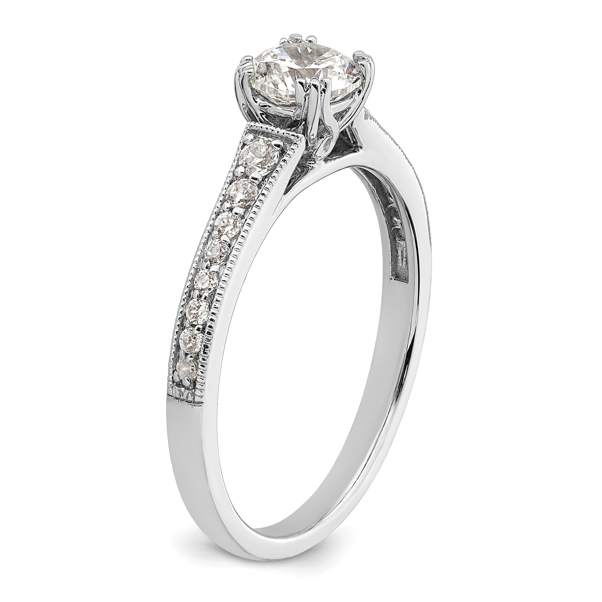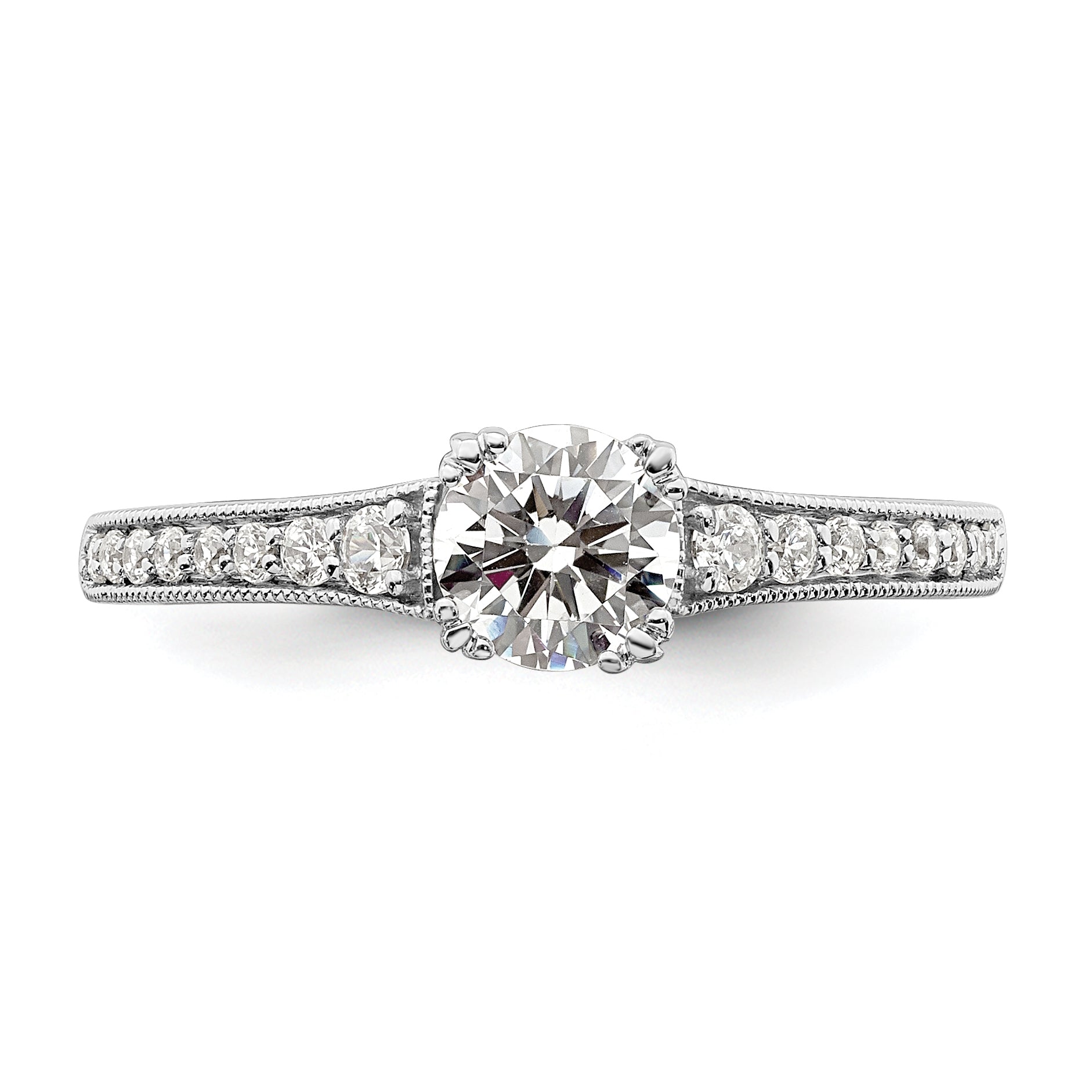 The 14K White Gold 1/6 Carat Diamond Semi-Mount Engagement Ring offers a stunning look perfect for celebrating love. Its polished finish and solid design showcase the sparkle of 16 small diamonds, set in a sleek band that tapers from 1.8 to 3 mm. The ring holds a 1/2 carat round center stone, ready for your preferred gem. Crafted with care, it features a prong-set head and an open back for comfort. The 14K white gold adds a bright shine, making the ring stand out. The 14K White Gold 1/6 Carat Diamond Semi-Mount Engagement Ring is a simple, elegant choice for that special moment.