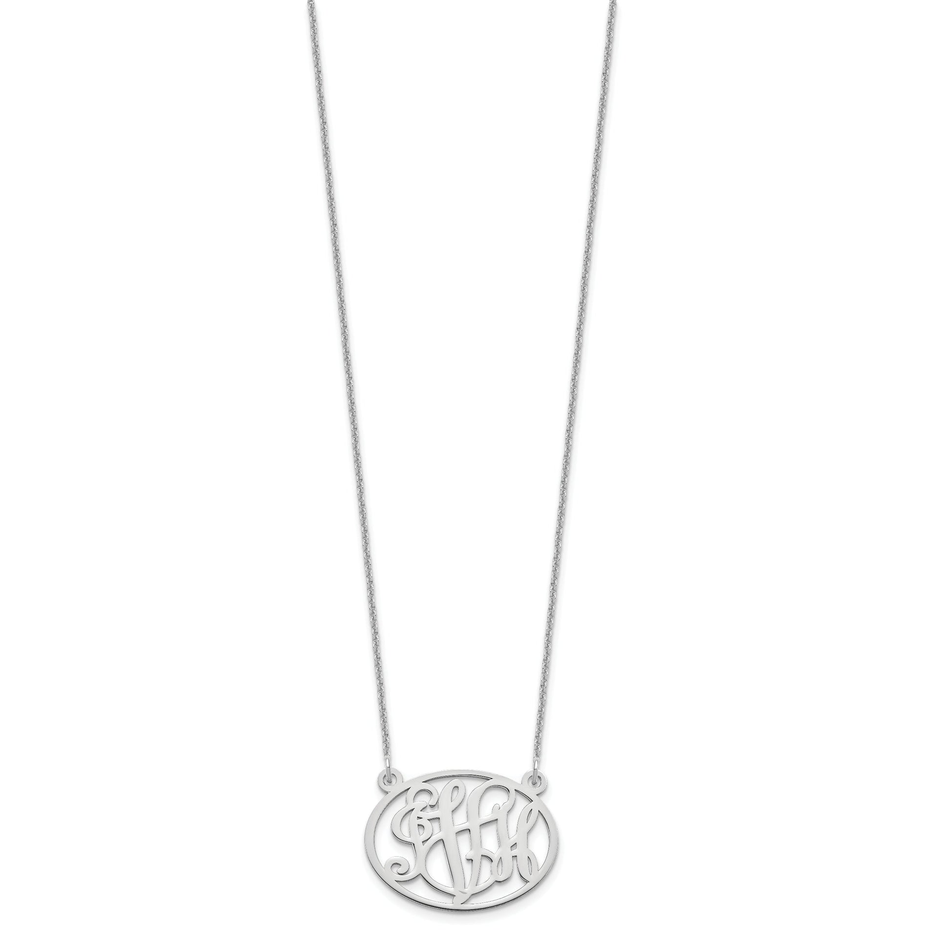 Discover the 14K White Gold Oval Monogram Necklace, a perfect piece for everyday wear. Crafted from high-quality 14K white gold, this necklace features a polished finish that gives it a sleek shine, enhanced by rhodium plating for added durability. The pendant measures 17mm by 23mm and is laser engraved with your initials, making it unique and personal. The lobster clasp ensures a secure fit, and the unisex design suits anyone. Whether for yourself or as a thoughtful gift, the 14K White Gold Oval Monogram Necklace delivers elegance with a personal touch.