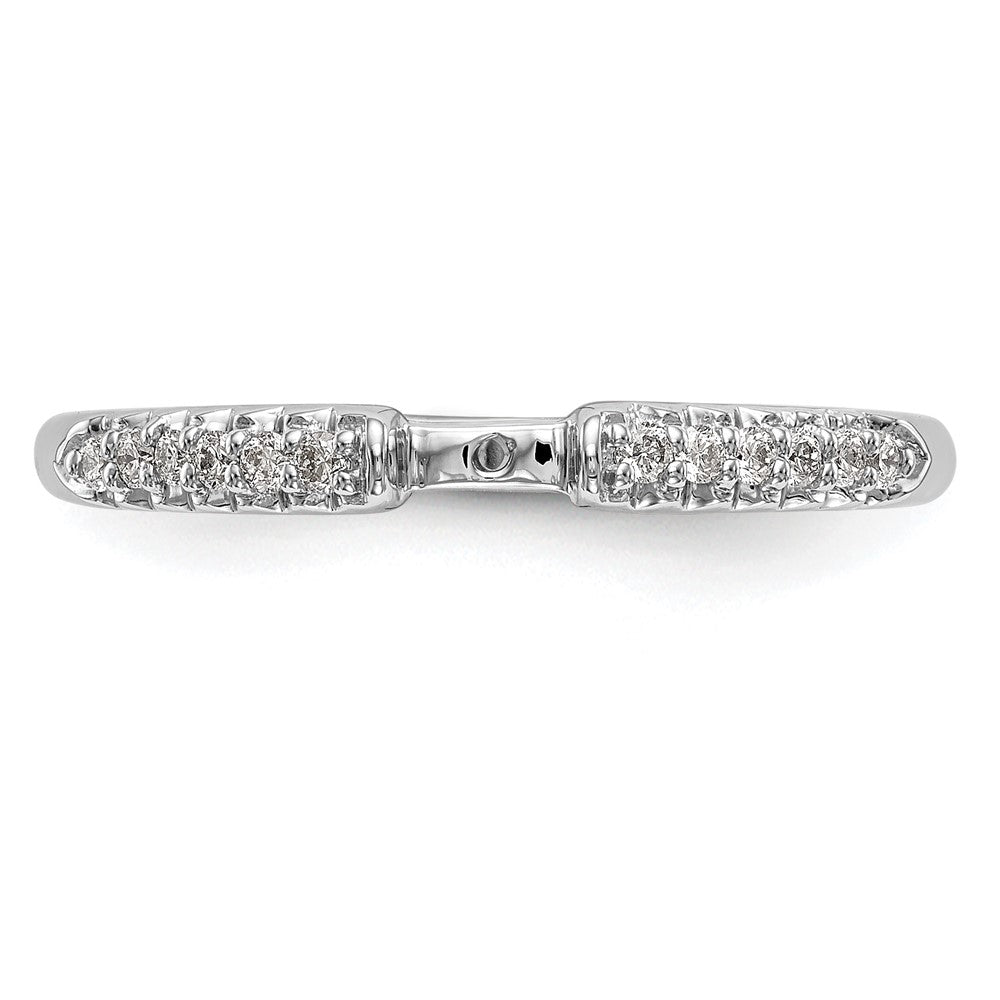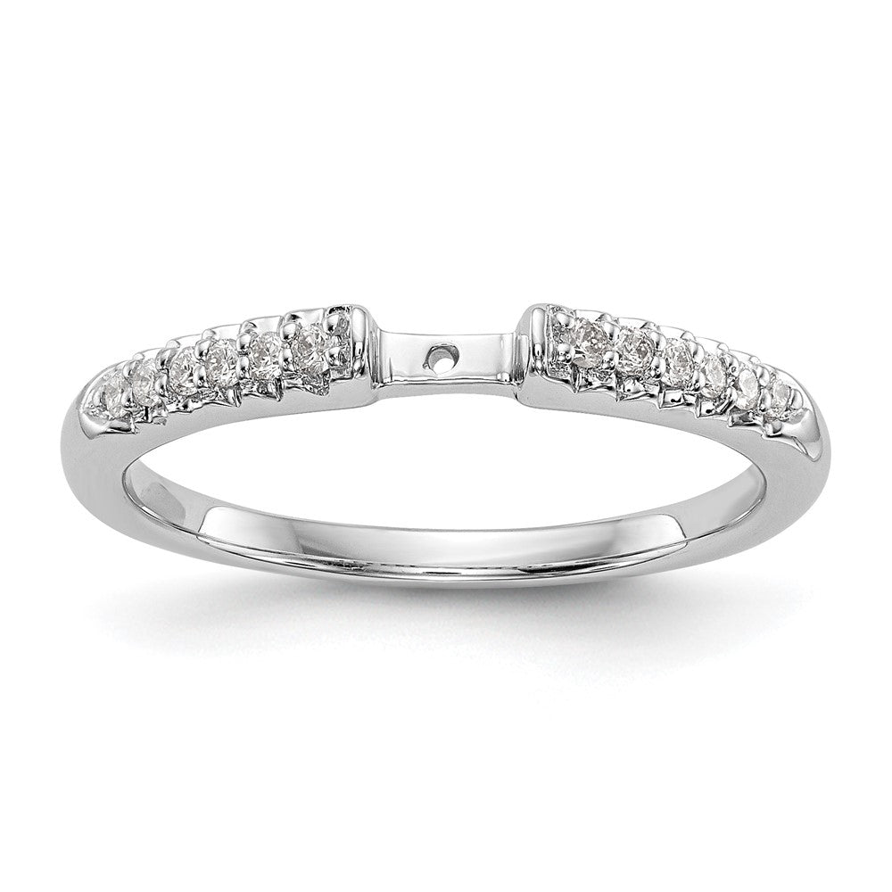 Discover the elegance of the 14K White Gold Peg Set 1/8 Carat Diamond Semi-mount Engagement Ring. This stunning piece features a polished finish, showcasing a beautiful semi-mount design perfect for your choice of center stone. Accented by brilliant diamonds, it is crafted from solid 14K white gold and plated with rhodium for that extra shine. The intricate round-cut stones, with their lively shimmer, promise to dazzle. This engagement ring allows you the flexibility to customize it, making it a unique testament to your love story. Elevate your romance with the 14K White Gold Peg Set 1/8 Carat Diamond Semi-mount Engagement Ring.