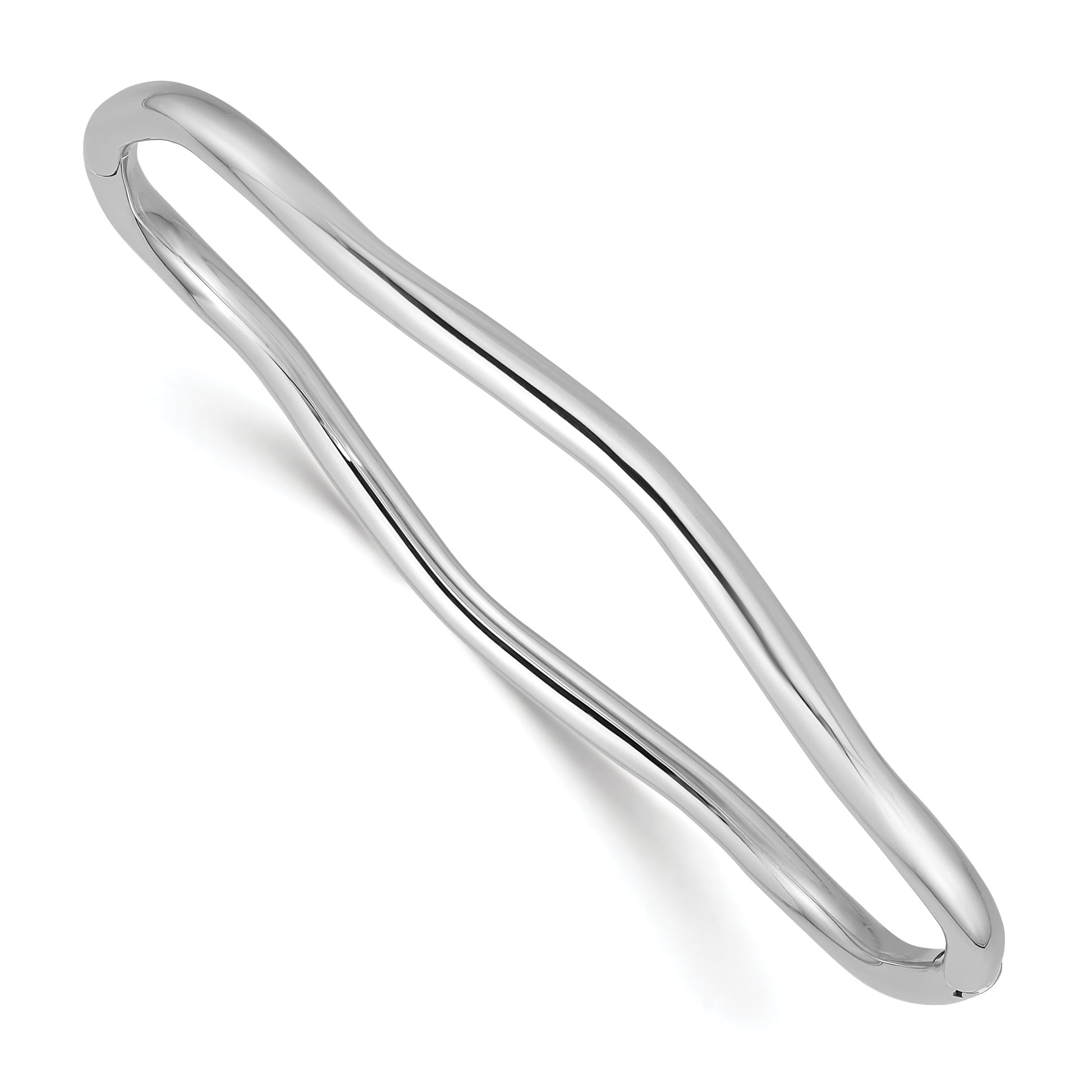 The 14K White Gold Polished Fancy Wavy Hinged Bangle is a stunning piece for any jewelry lover. Crafted from high-quality 14K white gold, this bracelet shines with a polished finish and durable rhodium plating. Its wavy design adds a chic touch, making it perfect for everyday wear or special occasions. The hinged clasp ensures a secure fit, while its solid build offers lasting beauty. The 14K White Gold Polished Fancy Wavy Hinged Bangle combines style and strength, making it a must-have accessory that elevates any outfit.