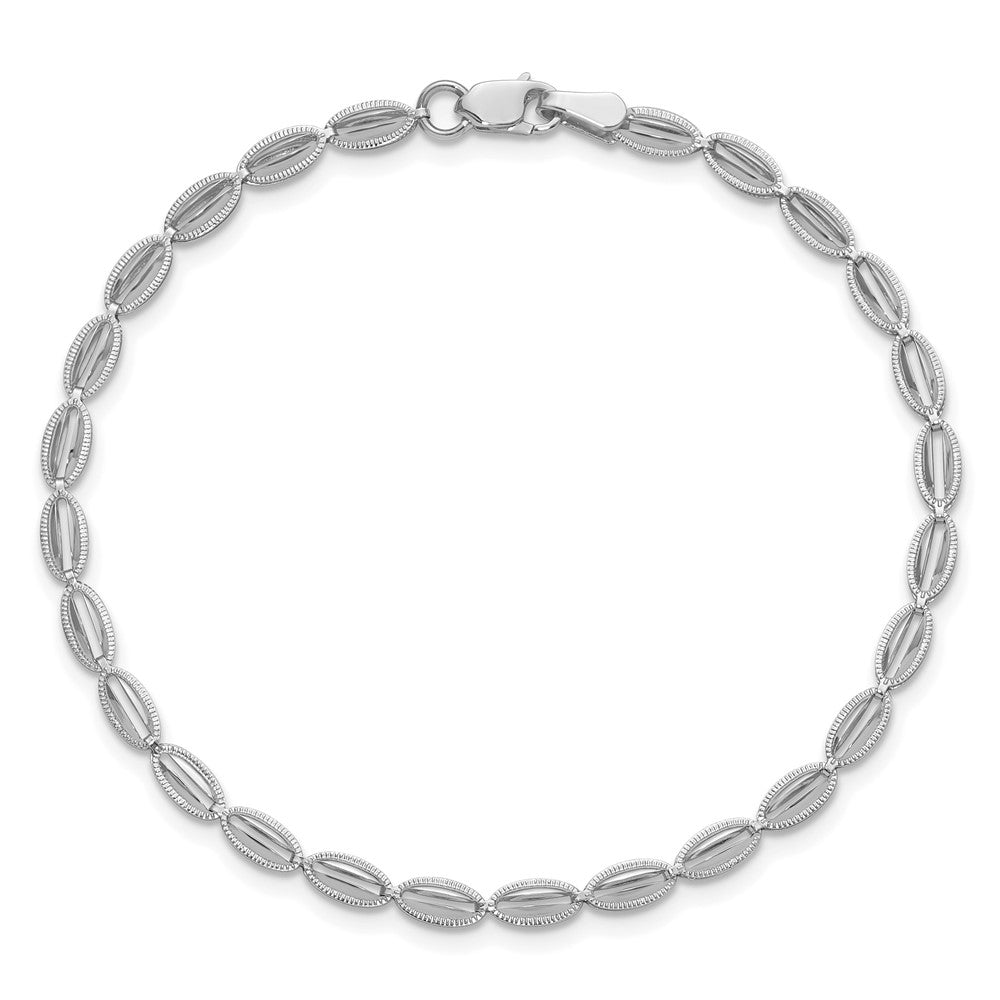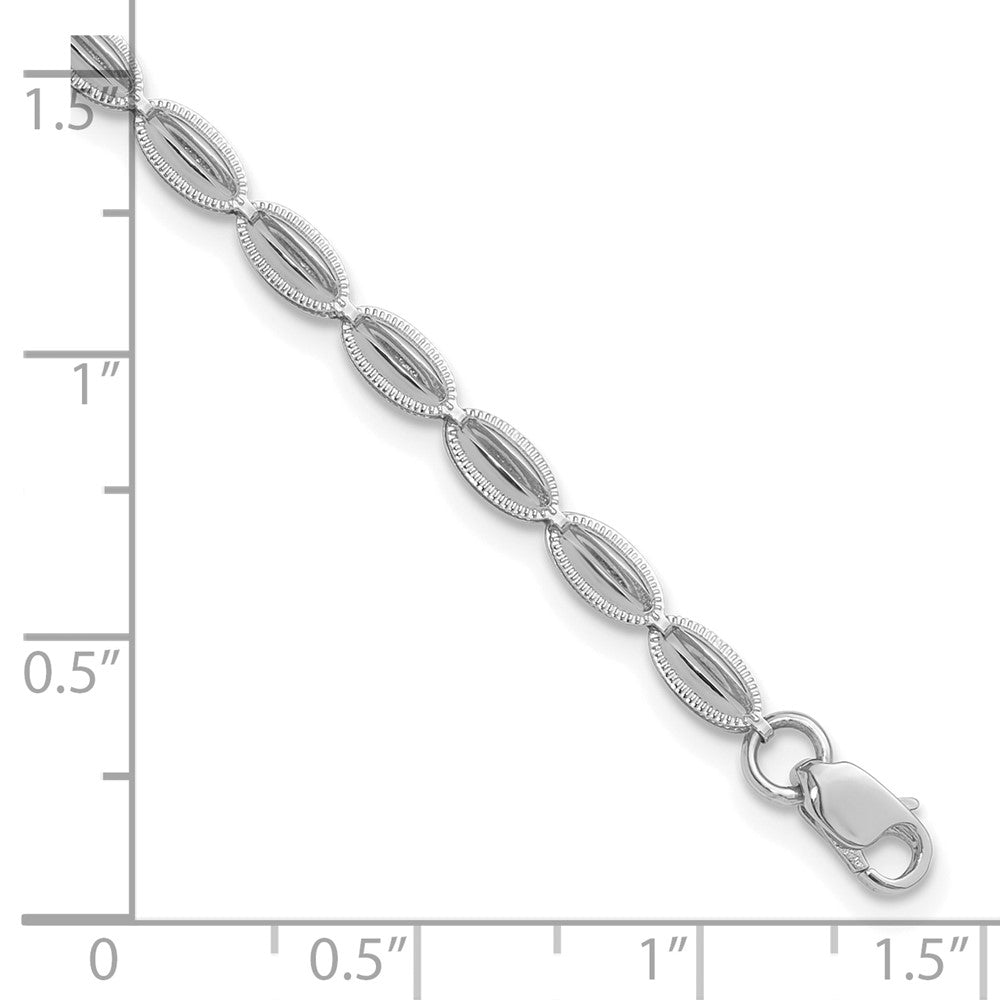 The 14K White Gold Polished and Textured Fancy Oval Link Bracelet is a stunning piece of jewelry that adds a touch of elegance to any look. Crafted from high-quality 14K gold with a durable rhodium plating, it offers great shine and strength. Its unique oval links combine polished and textured finishes for a chic vibe. Measuring 7.25 inches long, this bracelet fits comfortably and can be worn daily or for special occasions. The 14K White Gold 14K Polished / Textured Fancy Oval Link Bracelet is built to last with a lifetime guarantee, making it a timeless addition to your jewelry collection.