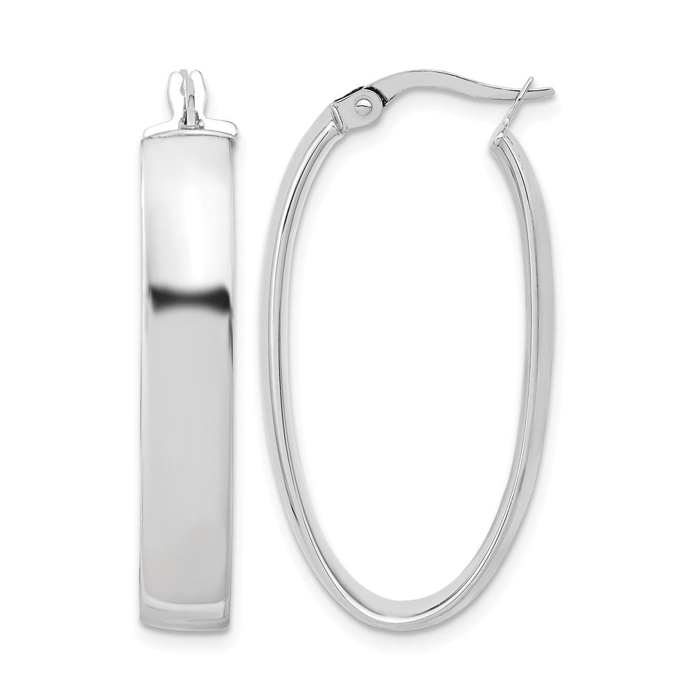 Discover the beauty of the 14K White Gold with Rhodium Plating Polished Oval Hoop Earrings. Crafted from high-quality 14K gold, these earrings shine with a polished finish and a sleek hollow design that feels light and comfortable. The rhodium coating adds extra shine and durability, making them perfect for everyday wear. With a generous 35 mm length and 17 mm width, these hoop earrings make a bold statement. Easy to wear with wire and clutch closure, the 14K White Gold with Rhodium Plating Polished Oval Hoop Earrings are a stylish choice for women seeking timeless elegance and lasting quality.