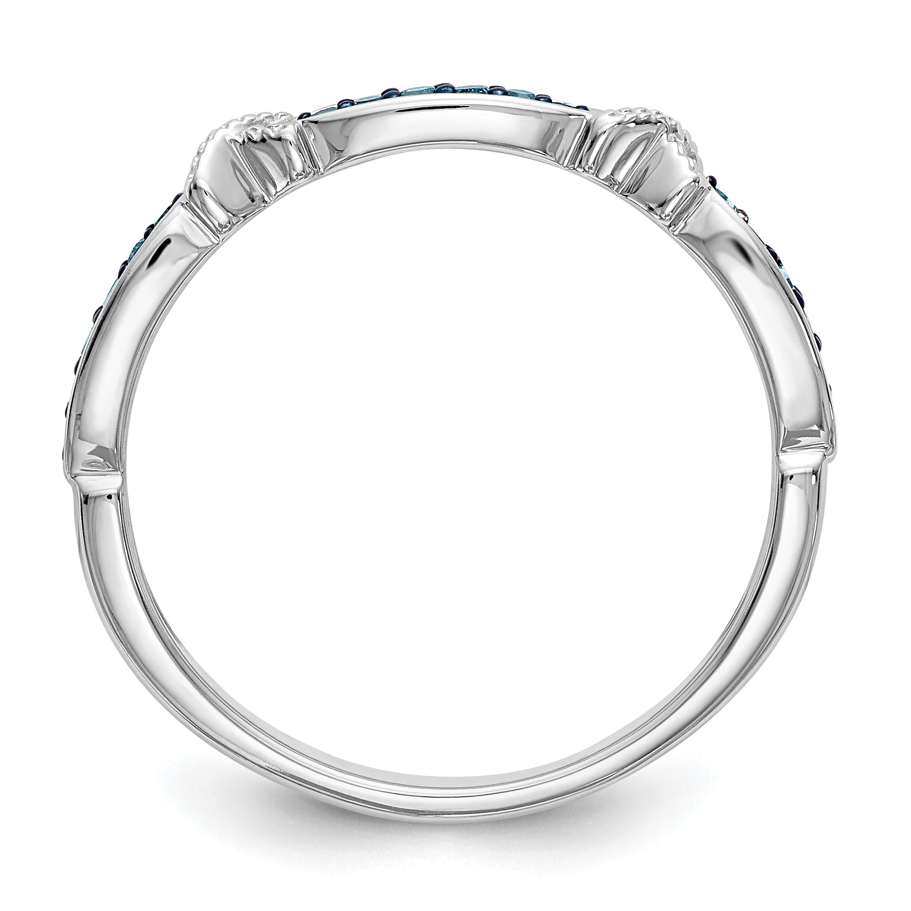 The 14K White Gold X-Design 1/10 Carat Blue Diamond Complete Band is a stunning choice for any jewelry lover. Its sleek, polished finish and unique crisscross shape draw your eye instantly. The band showcases 18 round blue diamonds, each carefully heated for extra sparkle. Crafted from real 14K gold, it’s solid and built to last. The band tapers from 2.4 to 2.1 mm, giving it a modern, elegant look. This ring is perfect for that special moment or for everyday style. With its beautiful blue stones and durable design, the 14K White Gold X-Design Blue Diamond Band is sure to catch compliments.