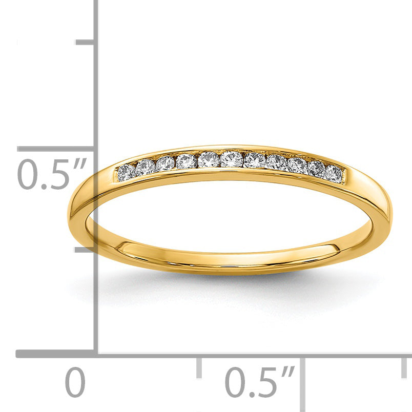 The 14K Yellow Gold 1/10 Carat Lab Grown Diamond Vs+ F+ Complete Channel Set Band offers a sleek and elegant look perfect for any woman. Crafted from polished 14-karat yellow gold, this ring features a full set of 11 lab-grown diamonds that sparkle bright with VS+ clarity and F+ color. The channel setting securely holds the round diamonds, each about 1.3mm wide, adding a touch of shine from every angle. With a band width of 2.25mm, this piece balances comfort and style. The ring is available in sizes 6 to 8, making it as versatile as it is stunning. A perfect blend of quality and charm, the Complete Channel Set Band stands out as a must-have for jewelry lovers.