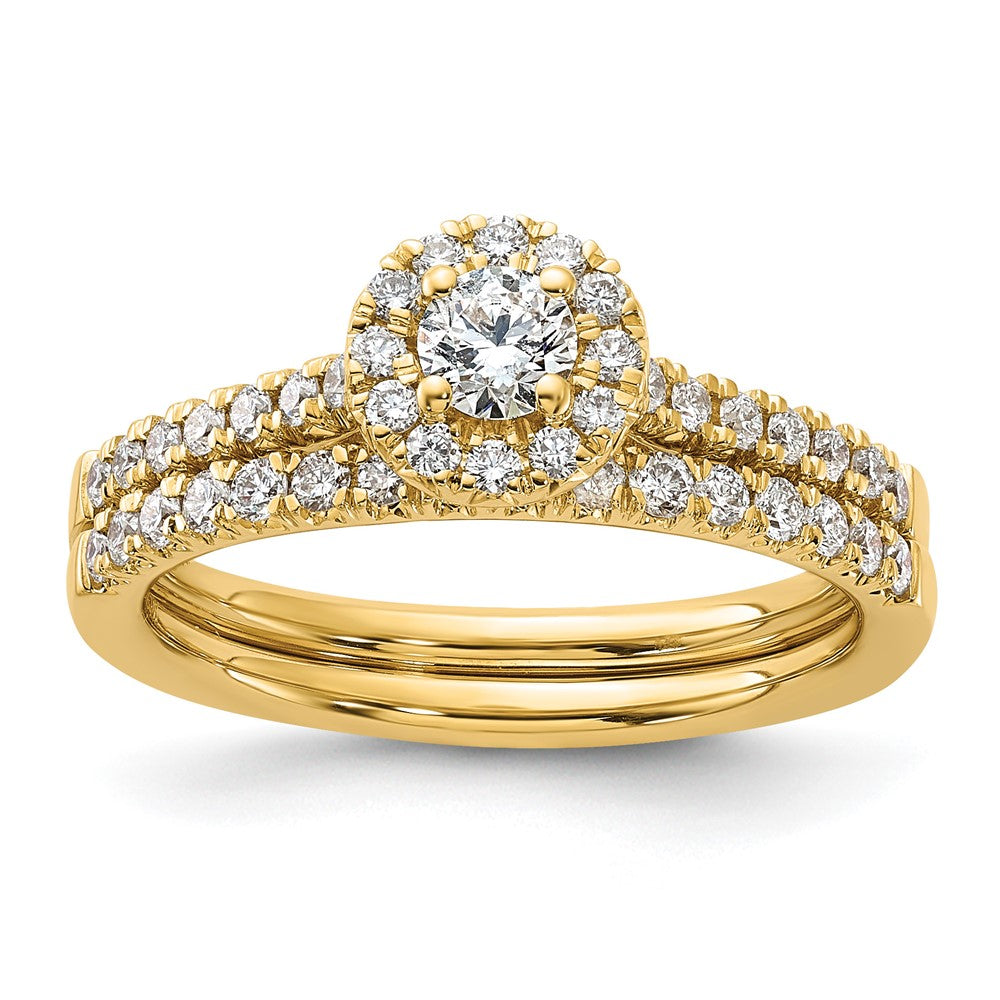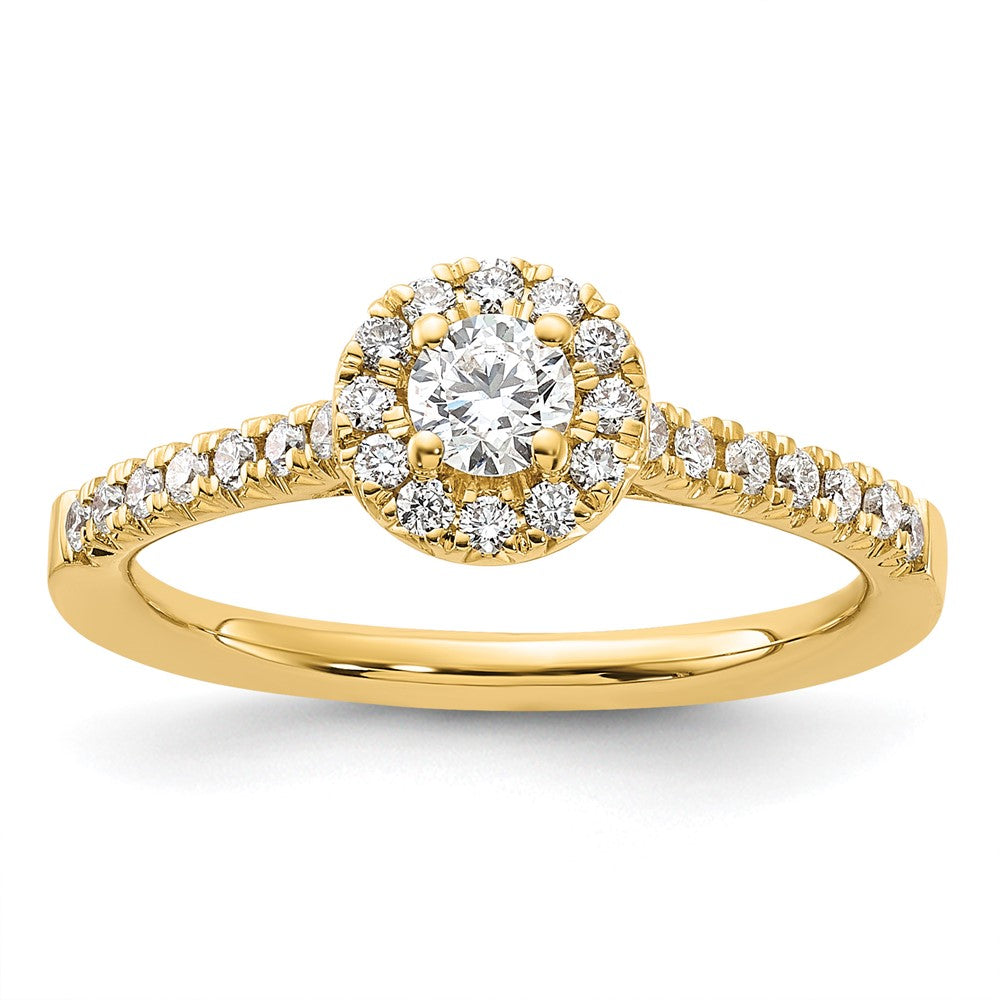 Celebrate your love with the timeless elegance of the 14k Yellow Gold 1/2 Ct. Lab Grown Diamond VS/SI+ G+ Round Halo Engagement Ring. Crafted from fine 14k gold, its polished finish enhances the brilliance of the lab-grown diamonds. The centerpiece round diamond, surrounded by a stunning halo of smaller diamonds, offers a total weight of 1/2 carat. With a delicate band width of 1.64mm and a sophisticated round (4 prong) head, this ring exudes style and grace. The VS/SI+ clarity and G+ color add an extra touch of perfection. Show your everlasting commitment with this stellar piece.