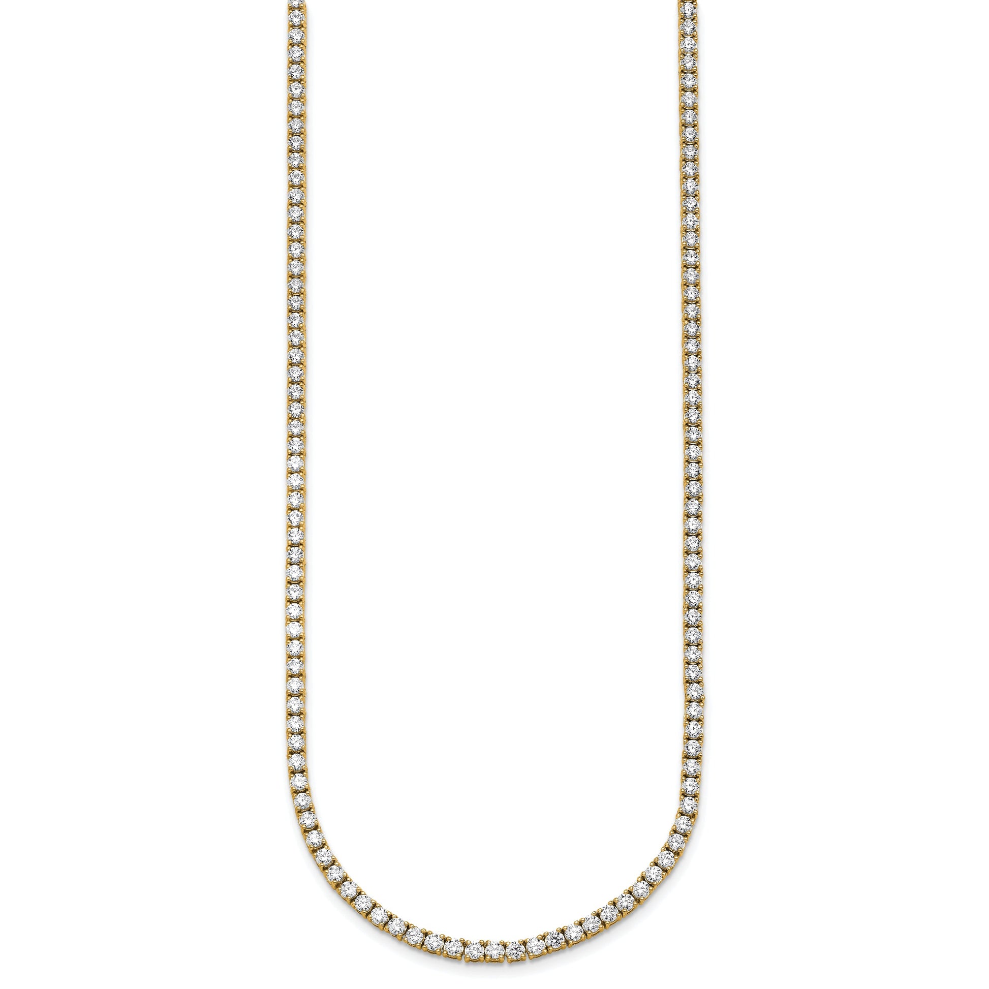 Elevate your style with the 14K Yellow Gold 10 Carat Lab Grown Diamond Vs+ F+ Complete Round 20 Inch Straight Tennis Necklace. Crafted from solid 14K gold, this necklace features two rows of stunning lab-grown diamonds that sparkle with clarity and brilliance. The 53 smaller diamonds and 135 larger ones, all round cut, are set in a sleek, polished chain, making it perfect for any outfit. Its safety box clasp ensures a secure fit, while the 20-inch length offers a bold yet elegant appearance. The 14K gold and high-quality lab-grown stones make the 14K Yellow Gold 10 Carat Lab Grown Diamond Vs+ F+ Complete Round 20 Inch Straight Tennis Necklace a piece you'll cherish.