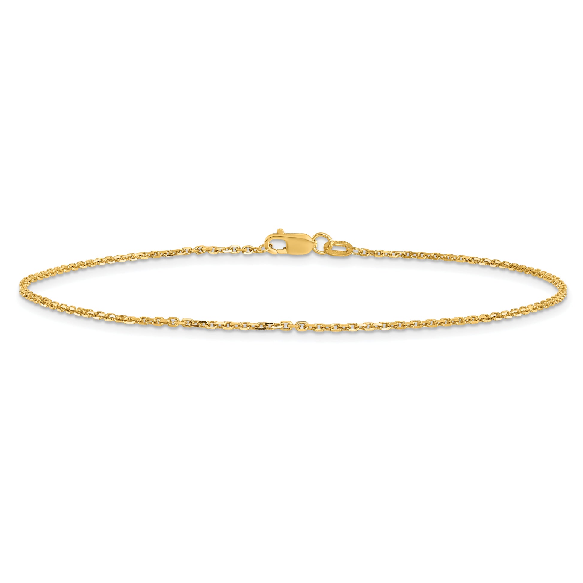 The 14K Yellow Gold 10 Inch 1.4mm Diamond-Cut Round Open Link Cable Anklet offers a blend of elegance and simplicity. Crafted from polished 14K gold, its delicate 1.4mm width and 10-inch length make it a sophisticated choice for everyday wear. The anklet's chain features diamond-cut details, adding a subtle sparkle that catches the light beautifully. Its lobster clasp ensures secure wear, while the open link cable design provides a modern touch. Perfect for women seeking a timeless accessory, this anklet is a luxurious addition to any jewelry collection. Enjoy the classic allure of this 14K Yellow Gold Anklet.