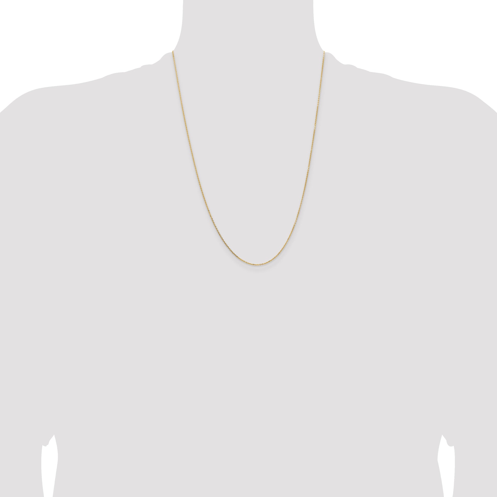 The 14K Yellow Gold 14K 1.05mm D/C Cable Chain is a sleek and durable necklace that adds a spark to any look. Made from polished 14K gold, it measures 24 inches long and features a fine 1.05mm cable design with a diamond-cut finish for extra shine. The chain is sturdy yet elegant, with a spring ring clasp that ensures a secure fit. Whether worn alone or layered with your favorite pendant, the 14K Yellow Gold 14K 1.05mm D/C Cable Chain delivers timeless charm and quality. Plus, it comes with a lifetime guarantee to keep your style shining bright.