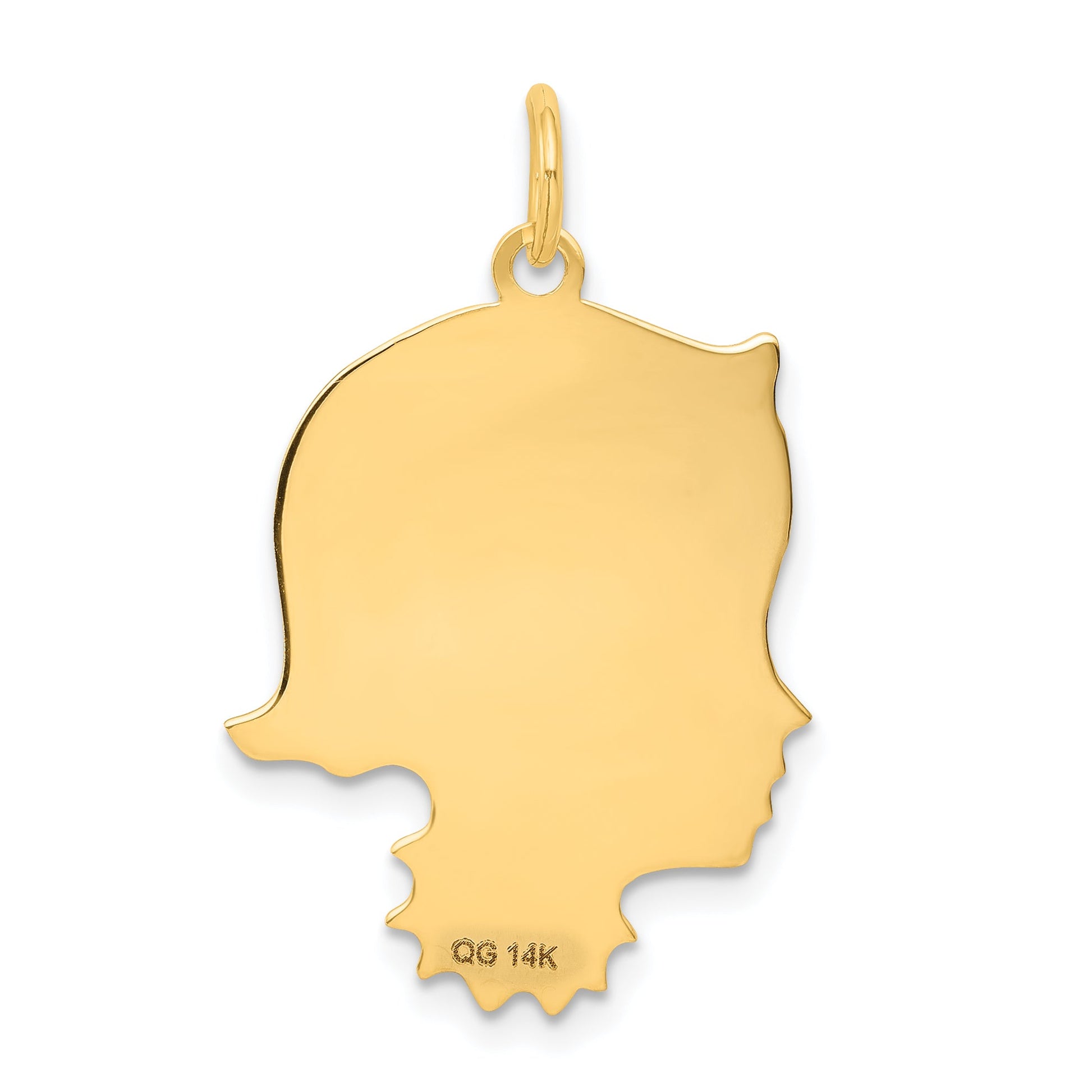The 14k Yellow Gold Engravable Girl Head Charm offers a beautiful blend of elegance and personalization. Made from solid 14K yellow gold, this charming piece features a polished finish and a unique left-facing girl design. With a charm length of 26 mm and a width of 20 mm, it stands out beautifully on any necklace. The lightweight charm, which is just 0.013 gauge thick, is perfect for engraving a special message or name, making it a unique gift. Elevate your jewelry collection with the 14k Yellow Gold Engravable Girl Head Charm and showcase your personal style.