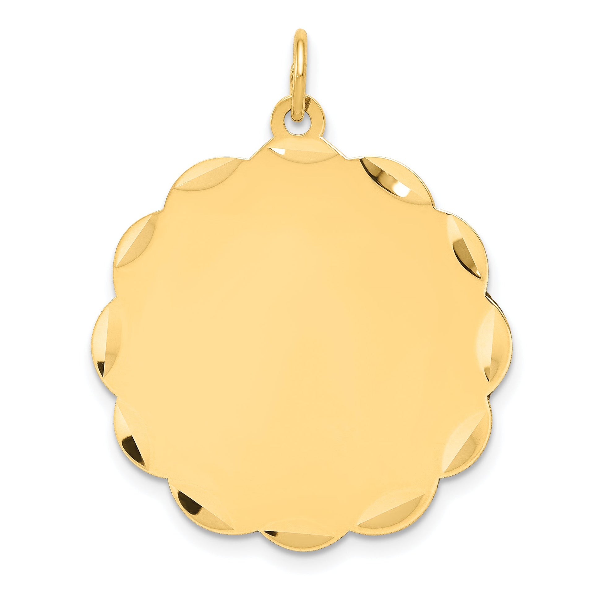 The 14k Yellow Gold Engravable Scalloped Disc Charm adds a touch of personalized elegance to any look. Crafted from solid 14K gold, this charm features a dazzling diamond-cut texture on the edges, making it shine beautifully in light. Measuring 31 mm in length and 25 mm in width, it offers ample space for engraving. The polished back enhances its luxurious feel, while the unique scalloped design sets it apart. Perfect for adding a special message, the 14k Yellow Gold Engravable Scalloped Disc Charm is a must-have for anyone wanting to wear their story.