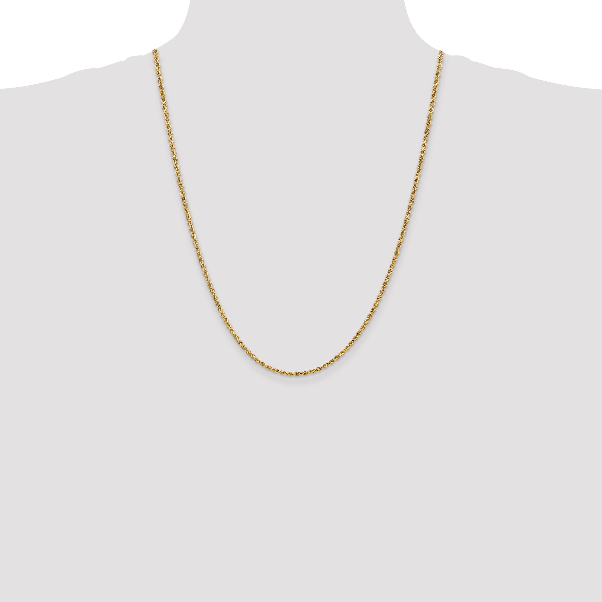 Introducing our 14k Yellow Gold 24-inch Diamond-cut Rope Chain with Lobster Clasp. This stunning piece combines elegance and durability with its 14K gold purity and polished finish. Its 2.25 mm width and diamond-cut texture add a dazzling touch of sophistication to any outfit. The lobster clasp ensures a secure and easy fit, making it a perfect choice for everyday wear or special occasions. Handcrafted to perfection, this rope chain is designed to last. Elevate your jewelry collection with the exquisite 14k Yellow Gold 24-inch Diamond-cut Rope Chain.